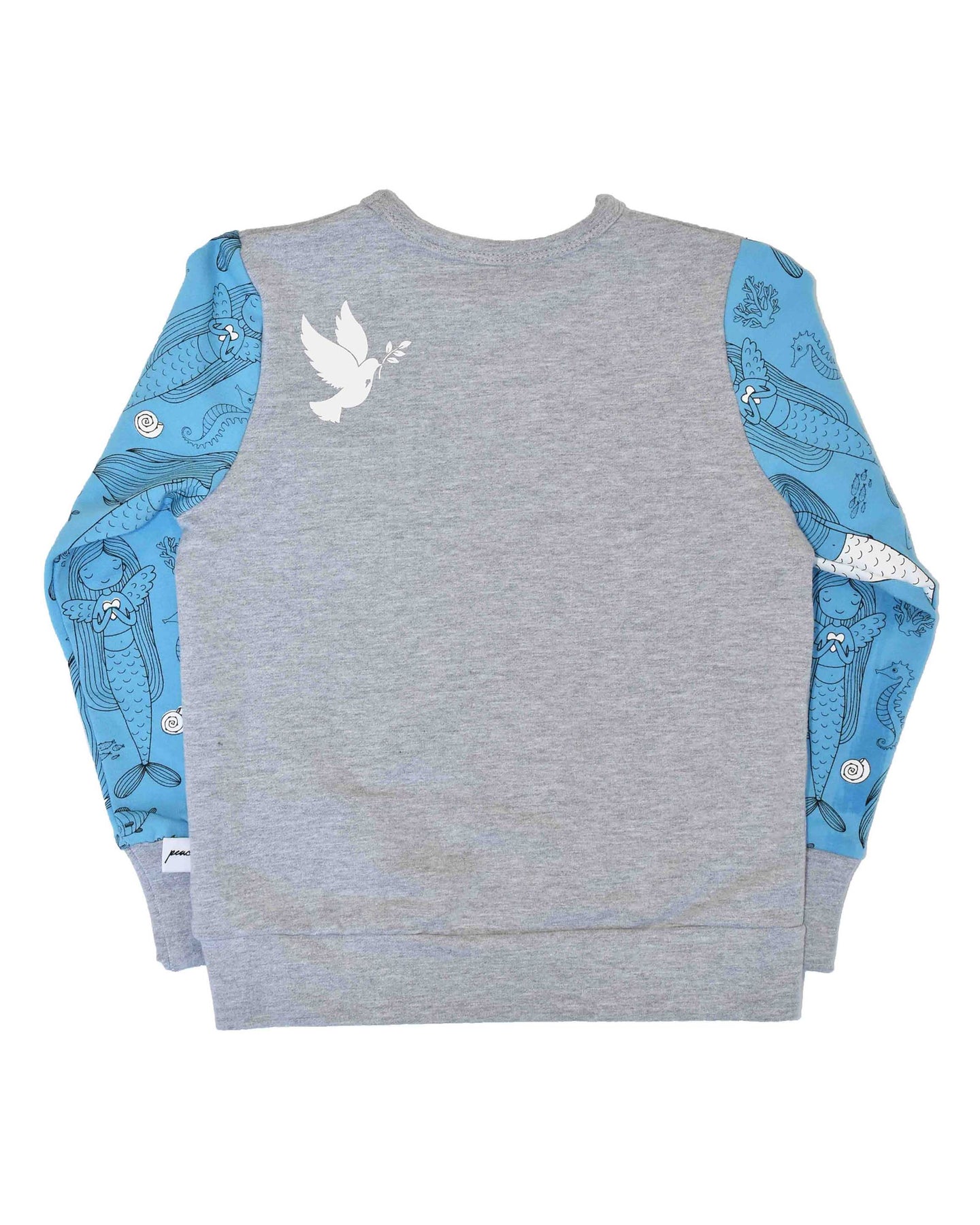 Mid weight, grey marle crew with blue mermaid print sleeves and mermaid tale front print.