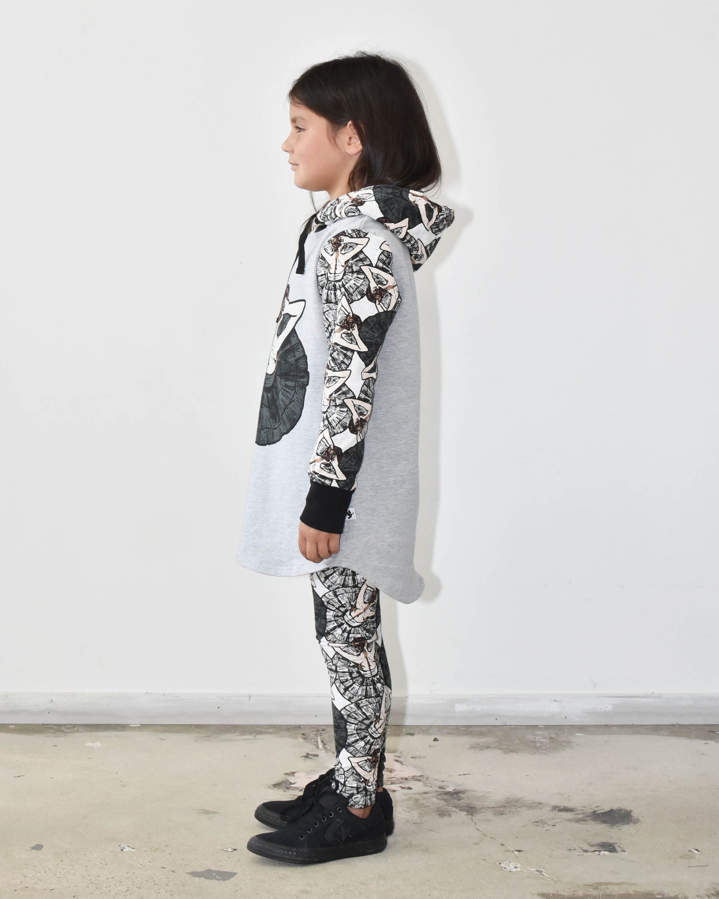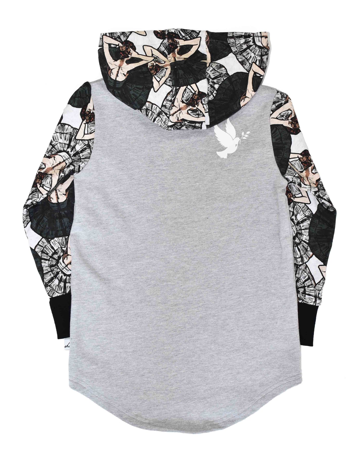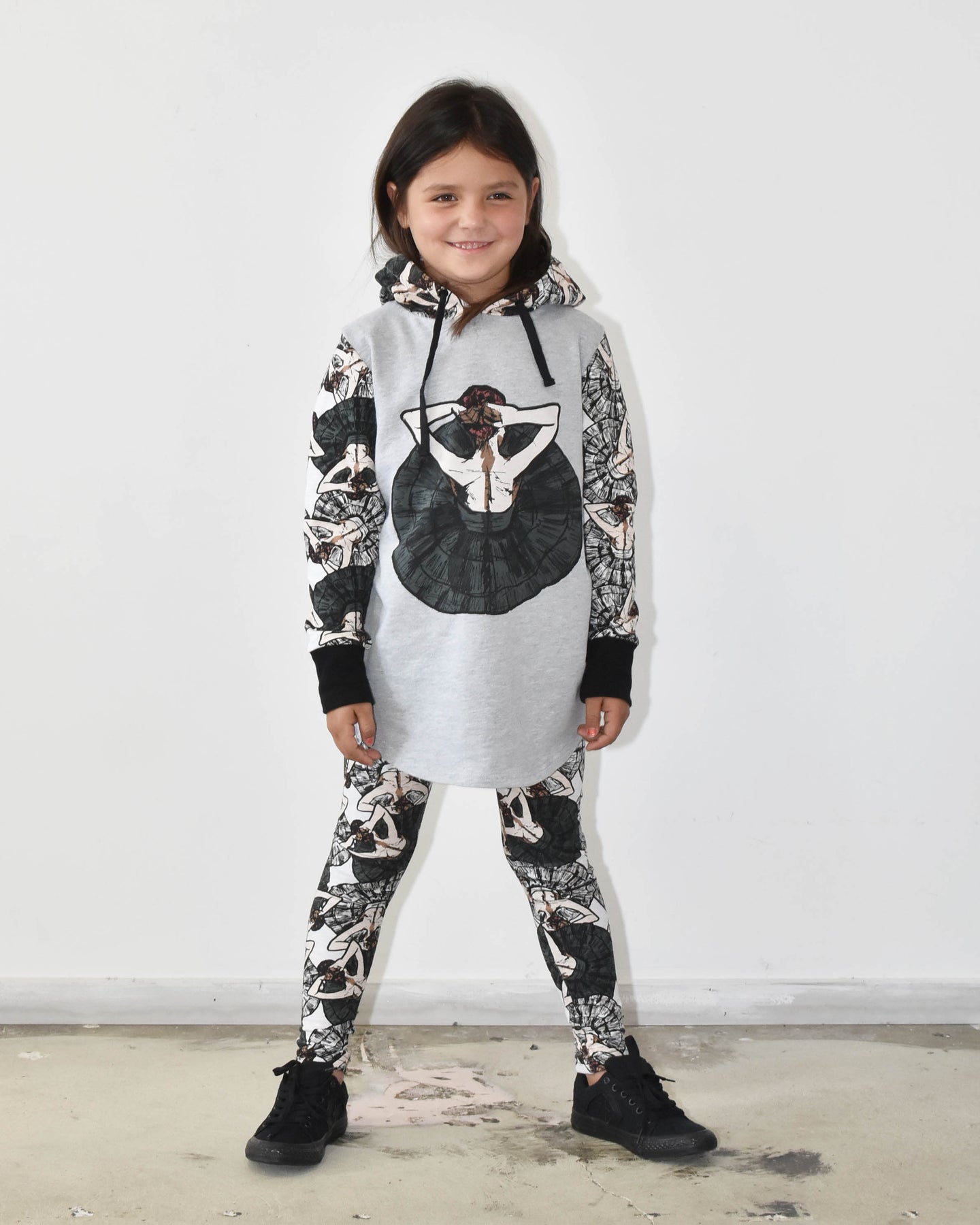 290gsm Cotton/Spandex Hood with all over ballerina sleeve and hood print and ballerina front print. This grey marle, longline hoodie is designed to go with your fave leggings. Mid weight an perfect for the fresh Autumn mornings. Take your style next level and team it with the swan lake legging.