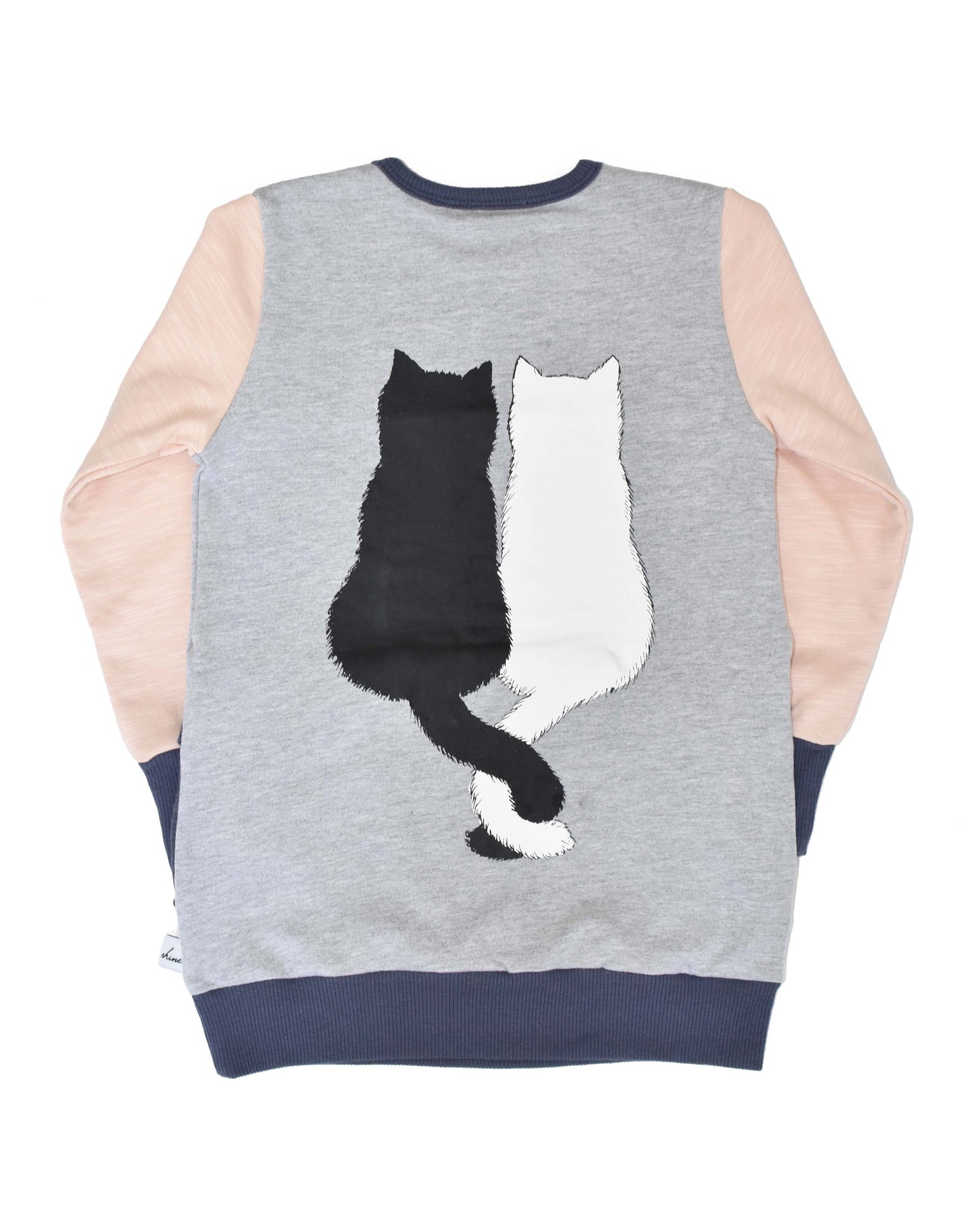 220gsm cotton/spandex unbrushed fleece crew with cut and sew paneling and cat back print