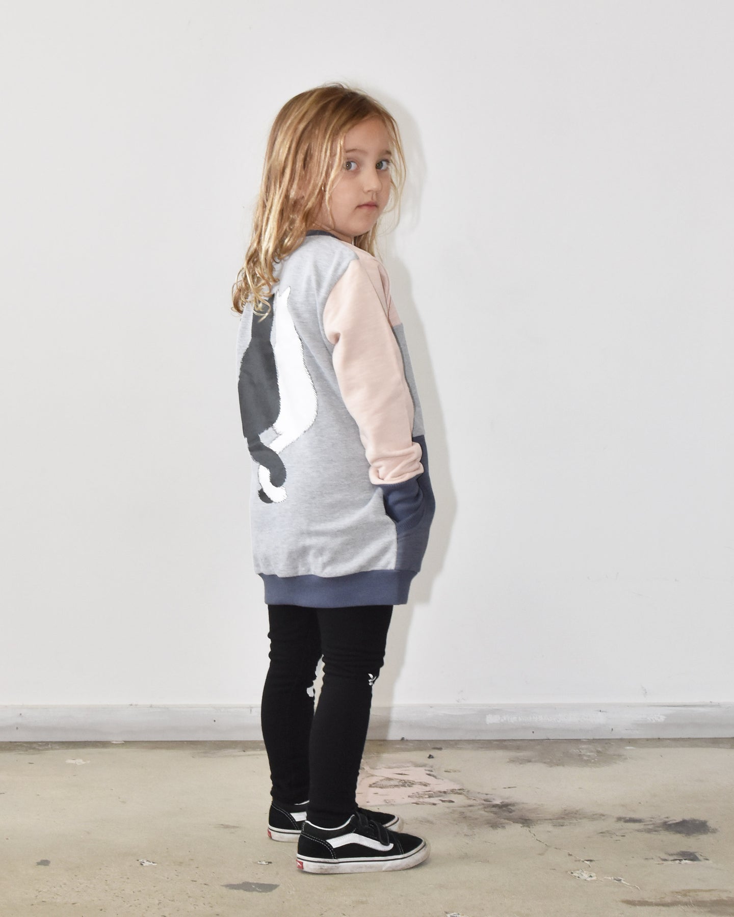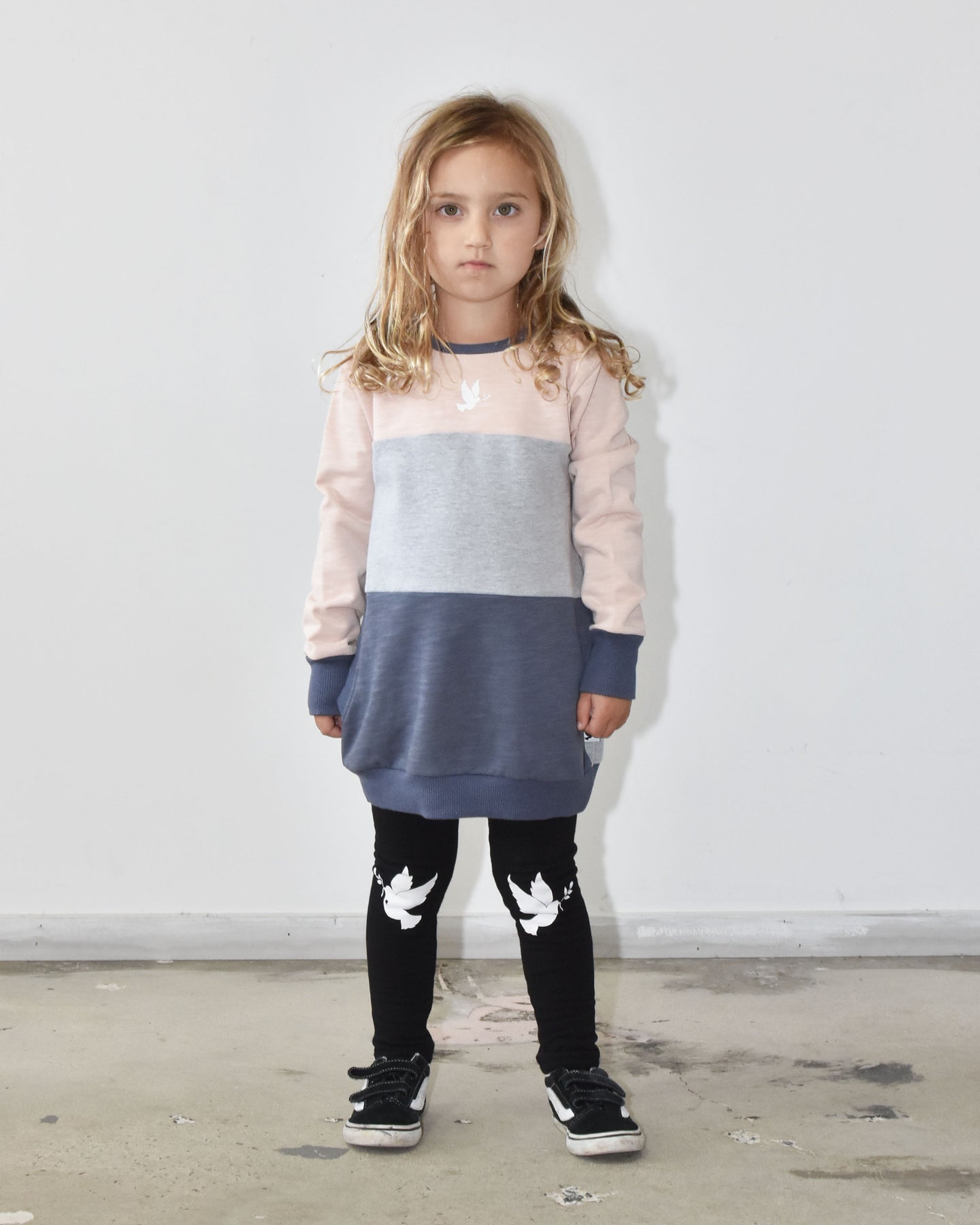 This gorgeous crew is a longer style designed to wear over leggings. Features our mini bird logo in white at chest. This crew is too cool for school. It's sure to be yours girls new fave. Great mid weight cotton for Autumn.
