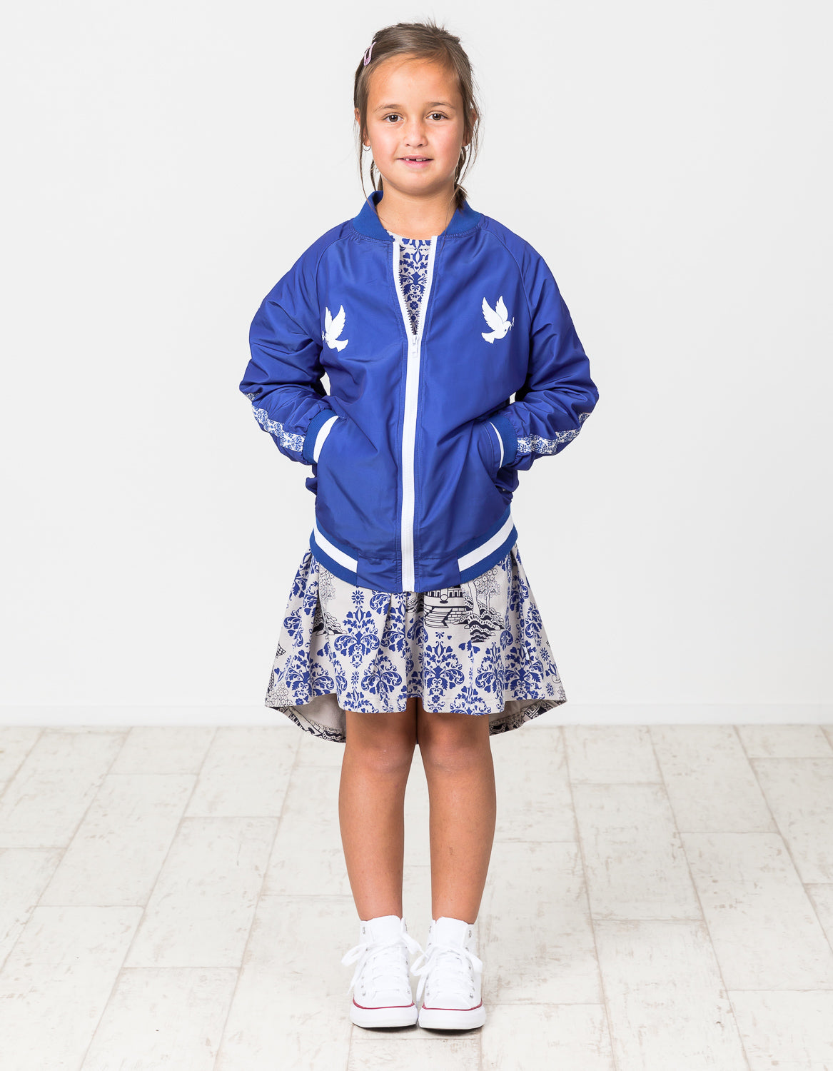 Shower proof polyester / nylon blue bomber with blue & white striped cuff. Pair of signature Kissed by Radicool doves on chest & awesome oversized dragon patch on the back. Oriental printed fabric stripes down sleeves & inside lining. Perfect trans-seasonal jacket for the coolest kids.