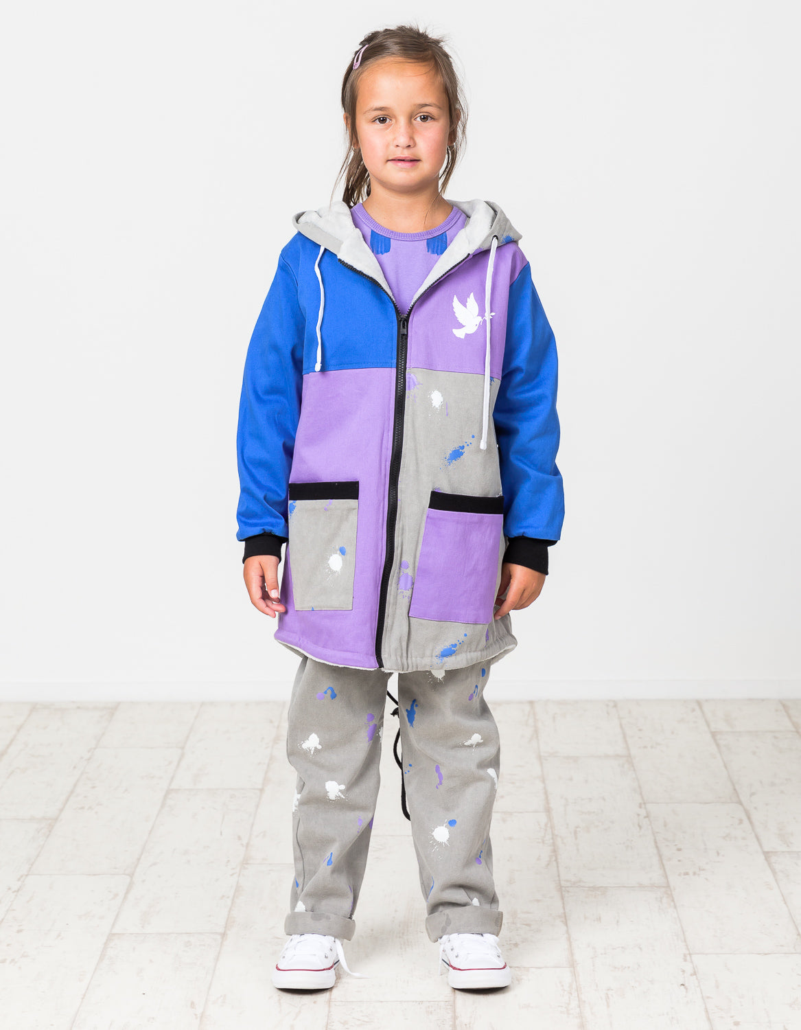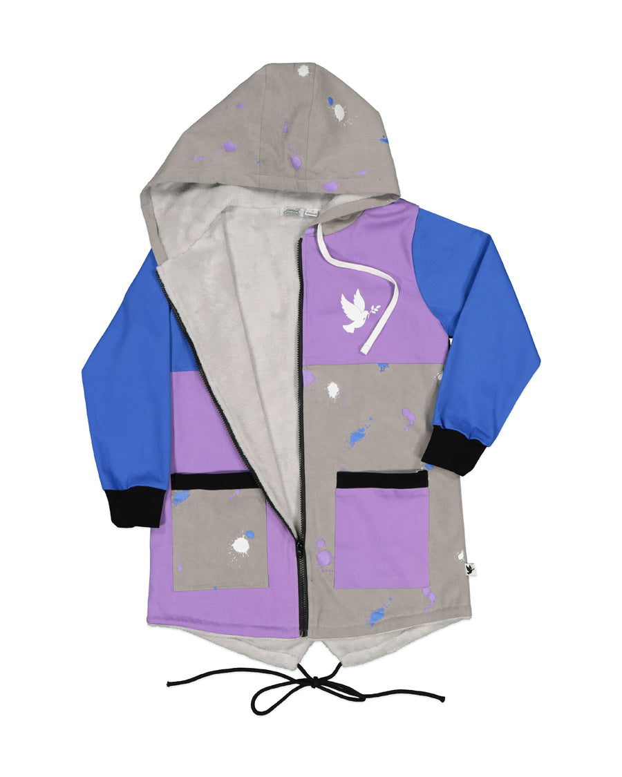Cotton denim long-line jacket with cut & sew paneling in cobalt blue, violet & paint splatter print grey denim, black ties, zip & trim. With its drop back & thick, super-soft fleece body lining this season’s version of our sell-out style will keep your lil’ dudette toasty on the chilliest days.