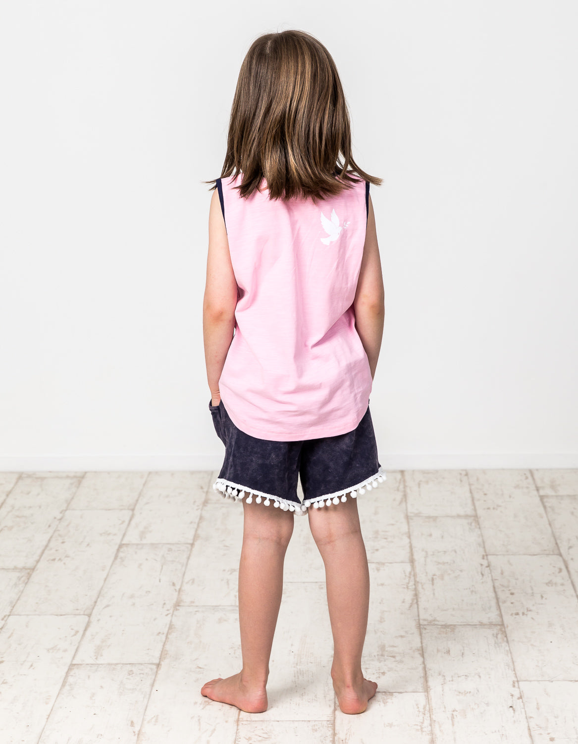 Cotton / spandex acid-washed short in navy with small Beach Days print on front leg & Kissed by Radicool dove on reverse.  Super-soft fabric with cute white pompom trim & roomy pockets, these are sure to be a fav with your mini!