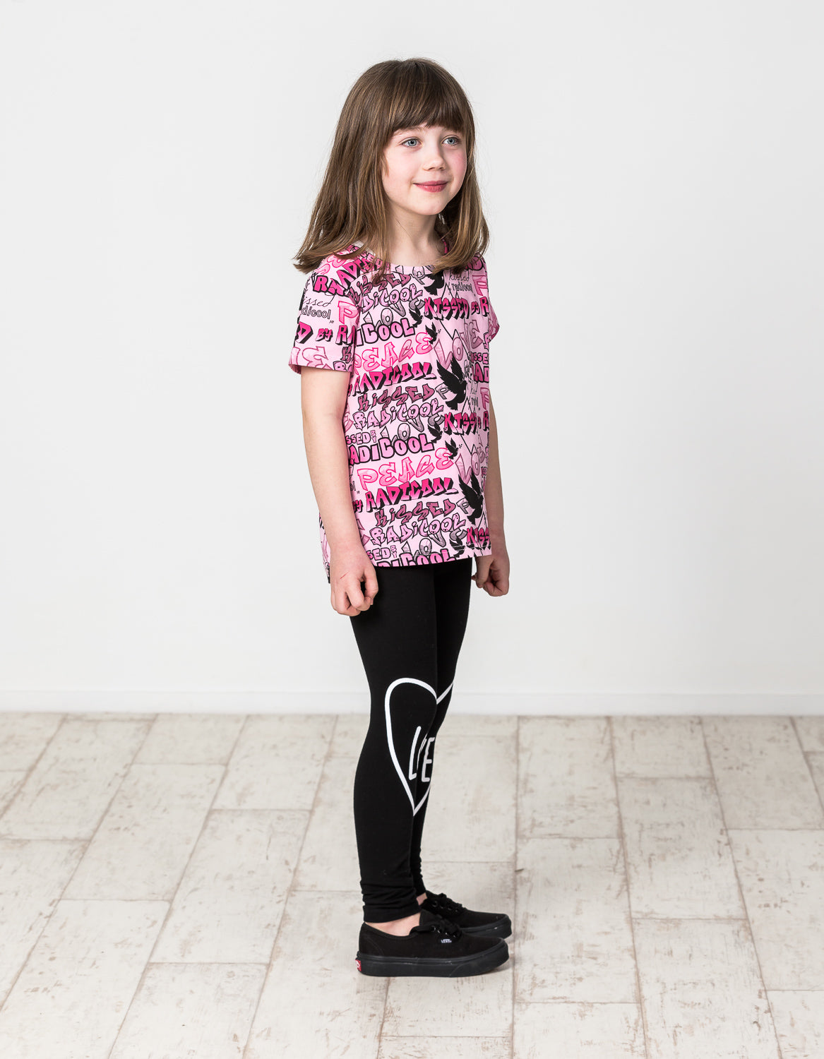 Back by popular demand this season! Cotton / spandex black legging for easy wardrobe styling with white LOVE knee print & signature Kissed by Radicool dove on reverse. Monochrome cool for the hipster babe.