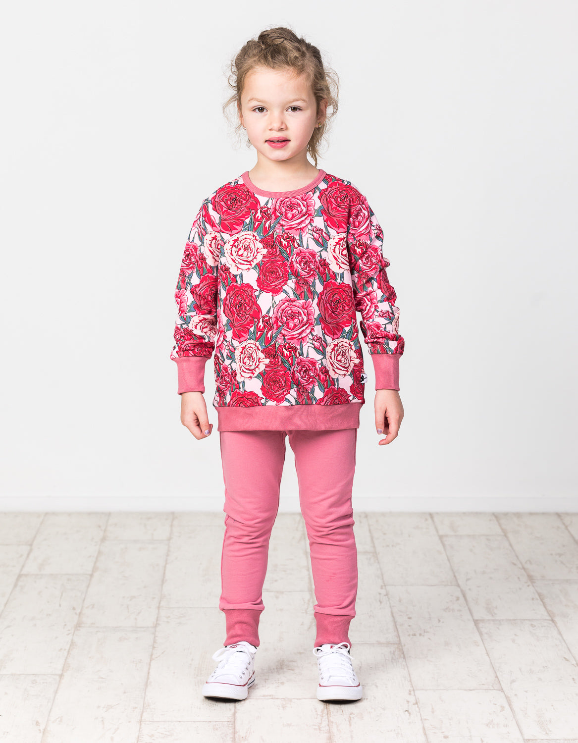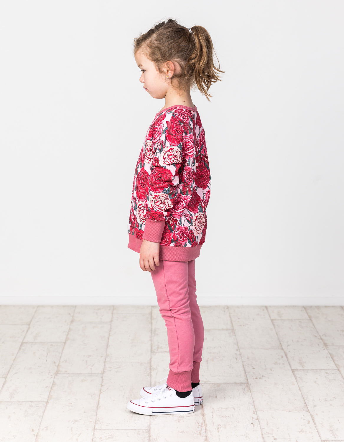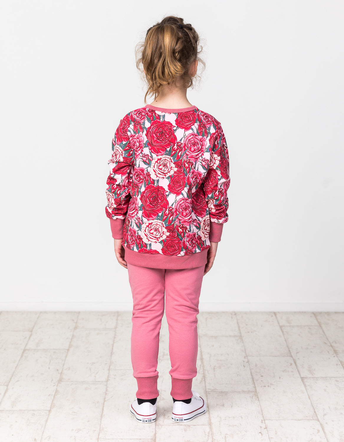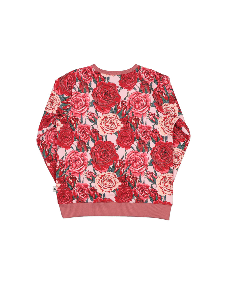 Mid-weight cotton / spandex crew in all-overfloral print with contrast rose trim. Easy wear crew to throw on when the mornings turns chilly. Mid-length style designed to sit at hip.