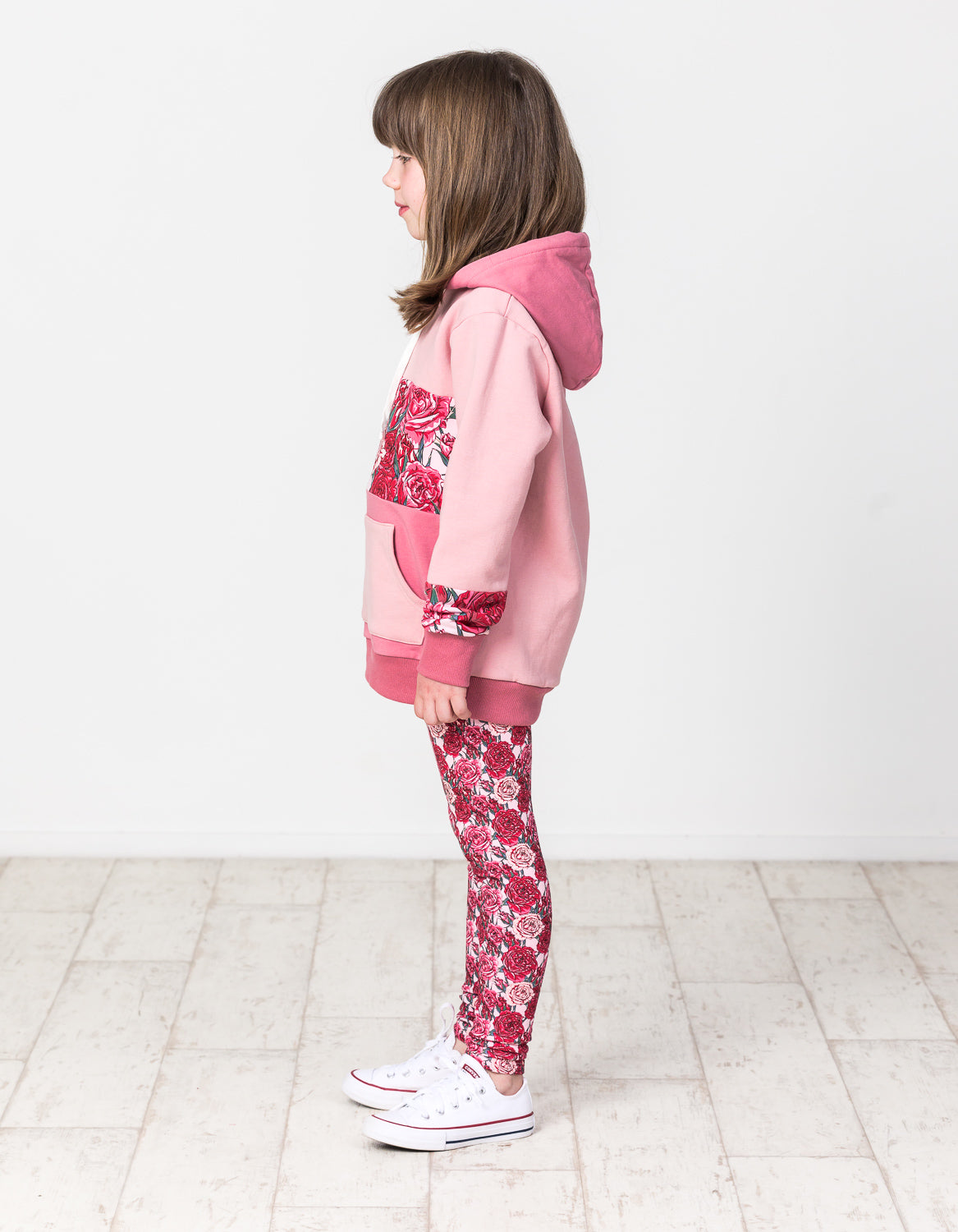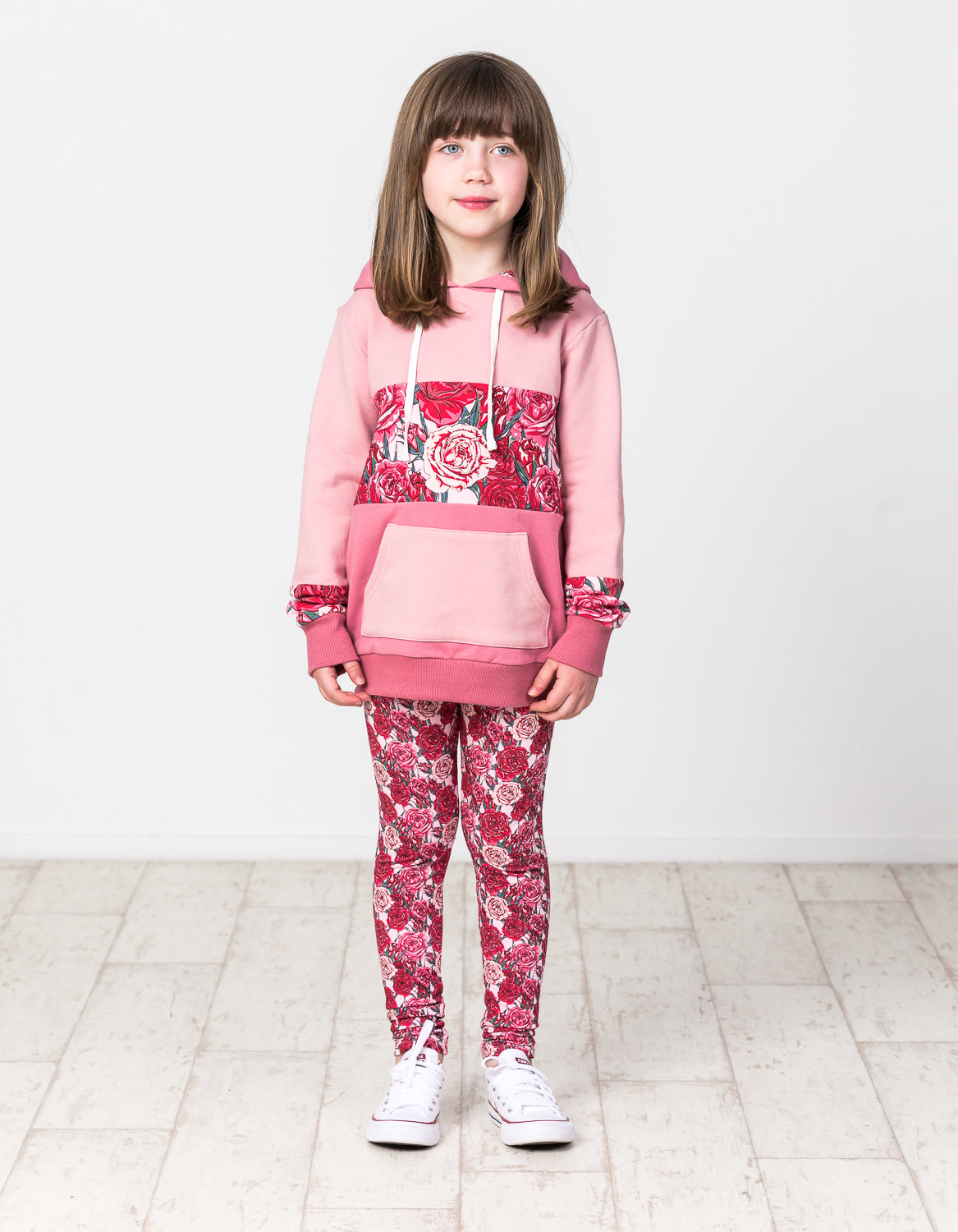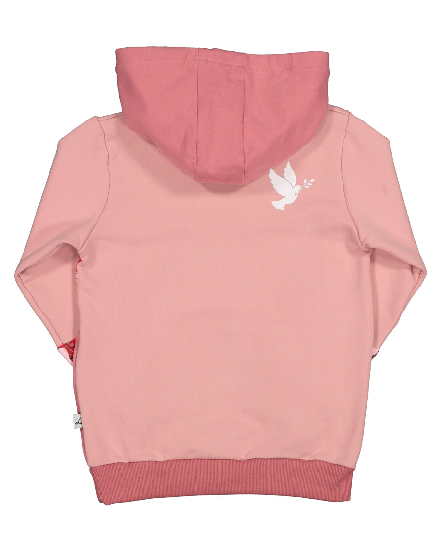 Brushed cotton / spandex hood with panels in floral print & shades of pink with kangaroo pocket. This one has your fave thumb-holes! Pale pink reverse with signature Kissed by Radicool dove. An essential addition to any pink lover’s wardrobe!