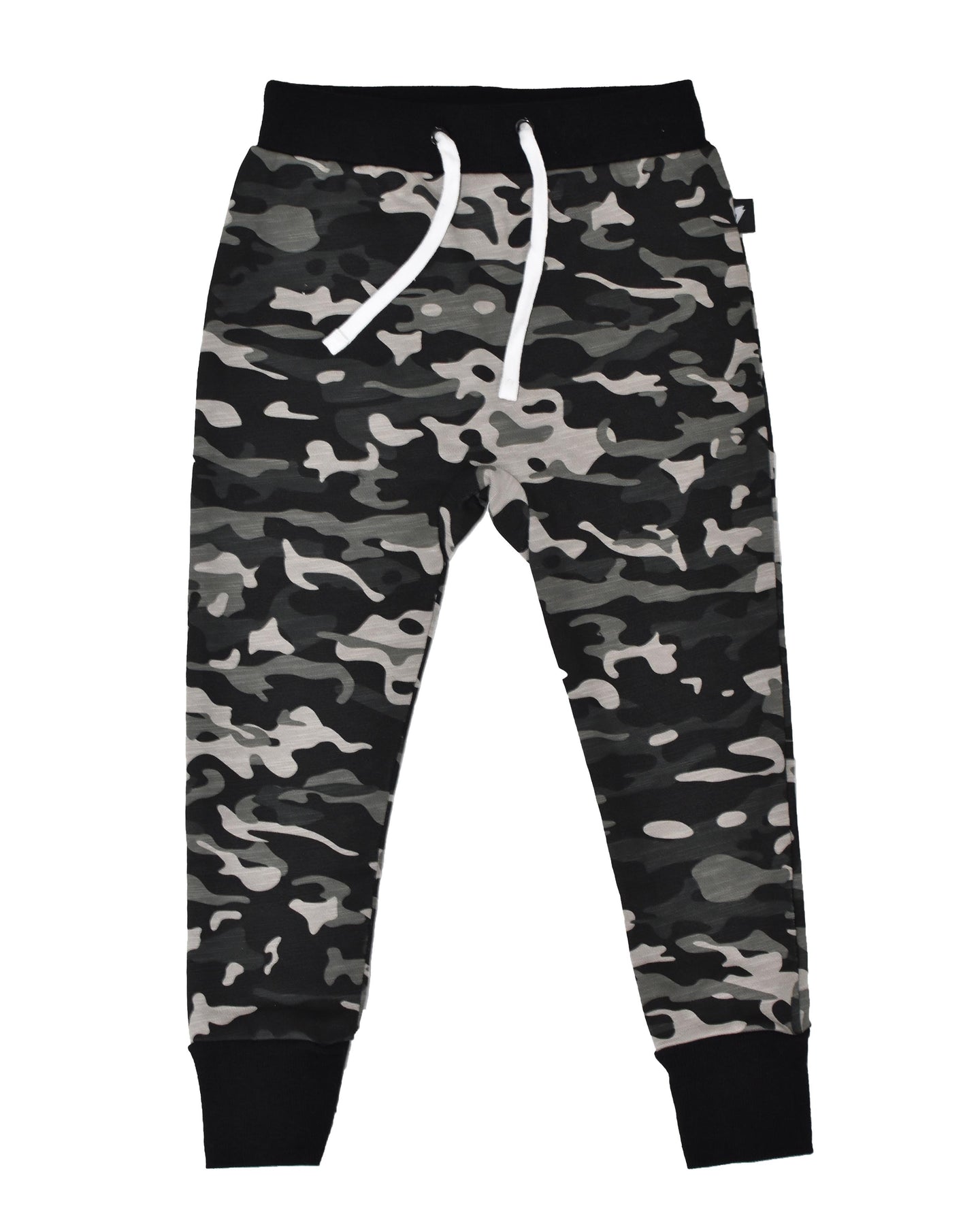 220gsm cotton/spandex skinny trackpant Sold out last season our camo trackie is back in muted greens, greys and black. Black trims and white drawstring and white logo thunderbolt outline on rear.