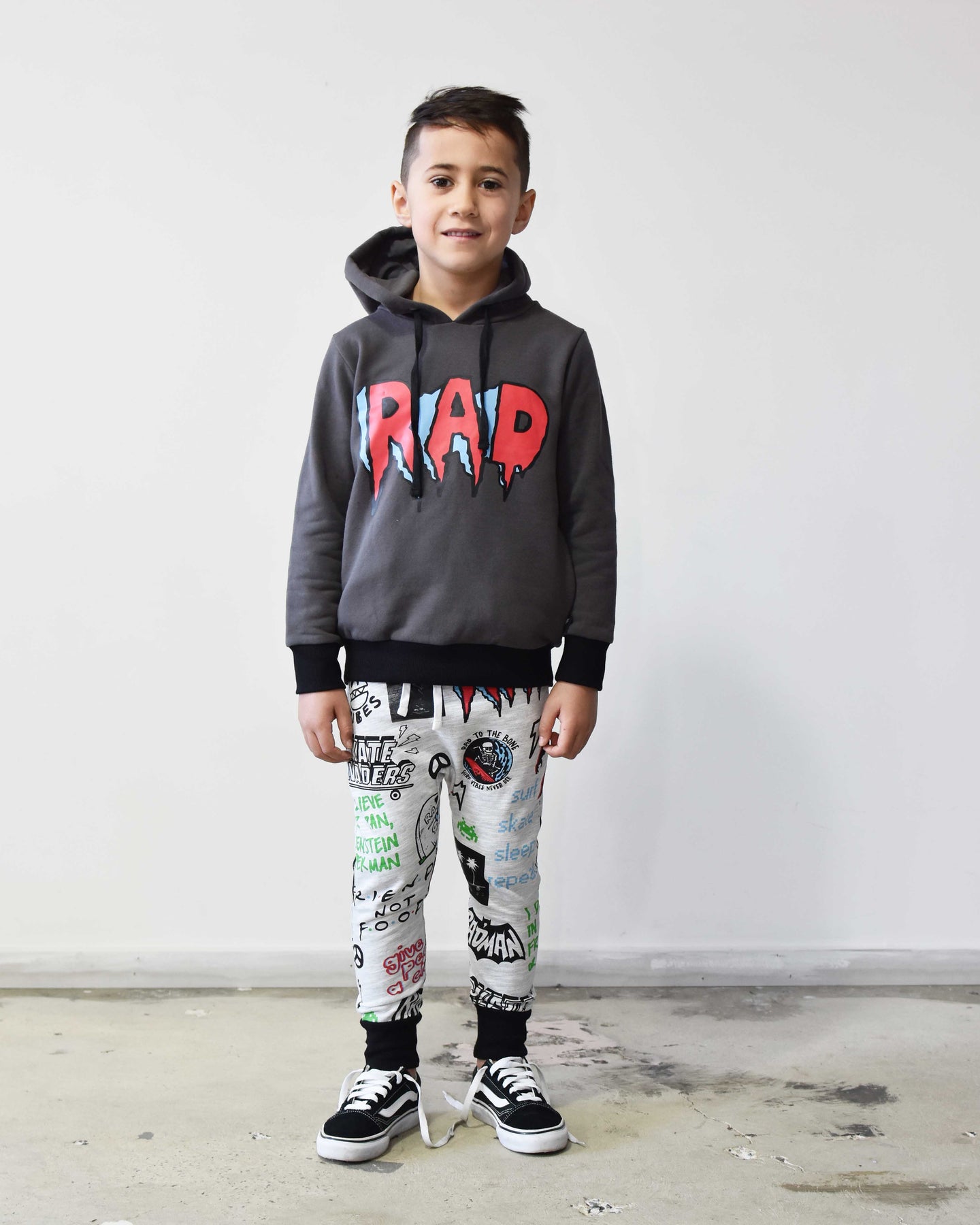 220gsm cotton/spandex, light grey pant textured cotton knit pant with graffiti print Skinny track pant with all over exclusive graffiti print. Why blend in when you can stand out!!