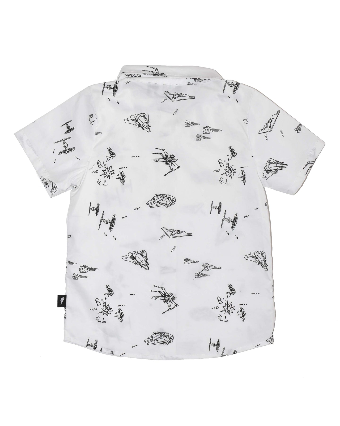 Cotton twill short sleeve shirt with rad intergalactic print in black. Button-through with chest pocket.