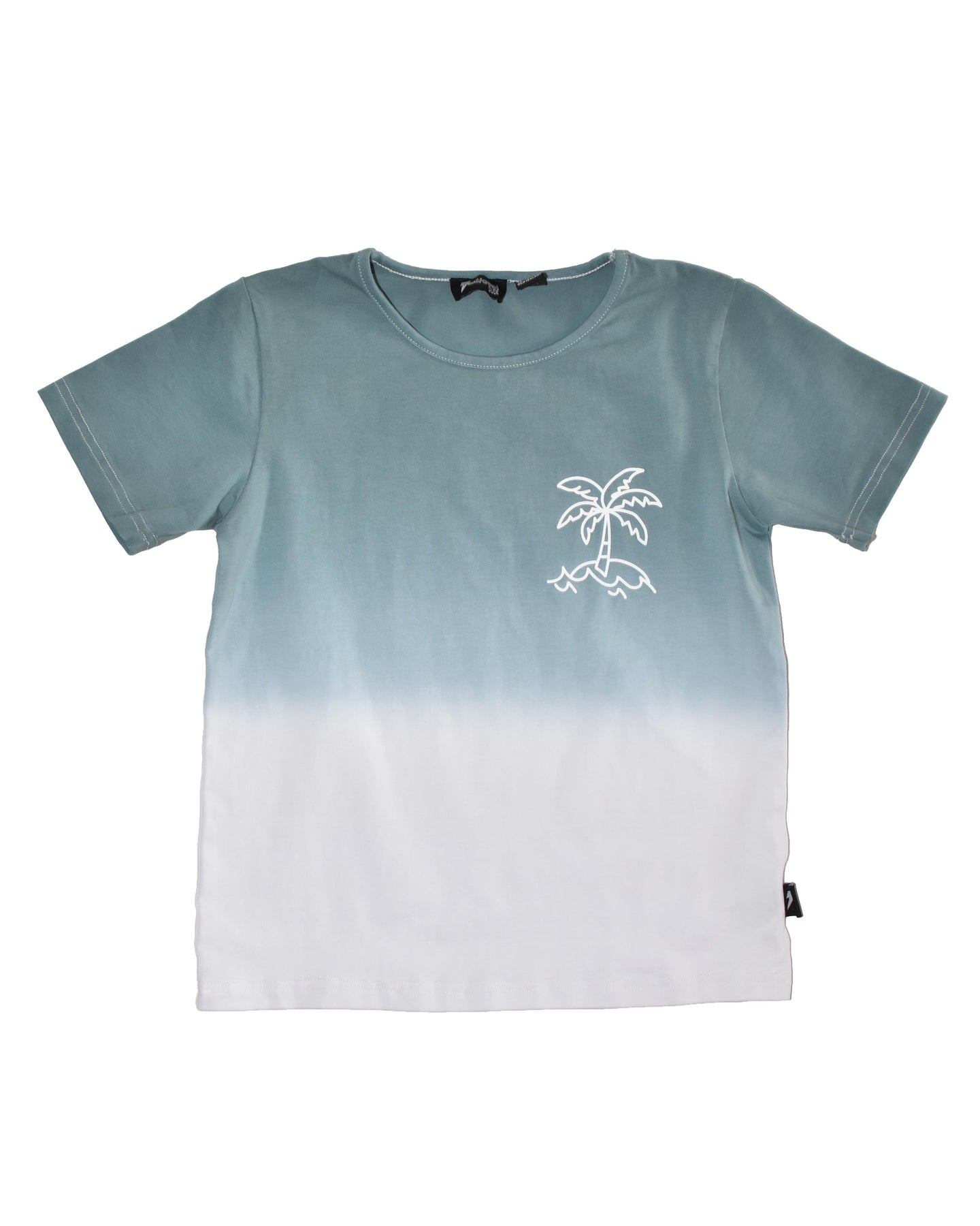 Cotton / spandex ocean dip-dyed tee with palm tree print on front & Radicool Dude signature thunderbolt on reverse.
