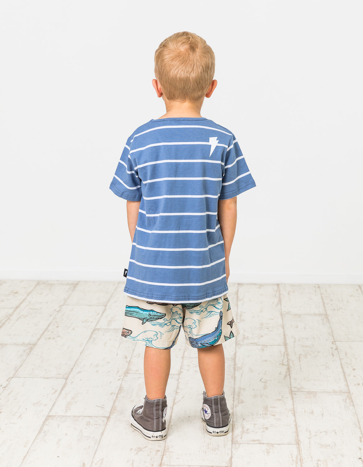 Cotton / spandex blue & white striped tee with front contrast pocket in mustard. Such stretchy & comfy fabric they’ll want to wear it again & again!