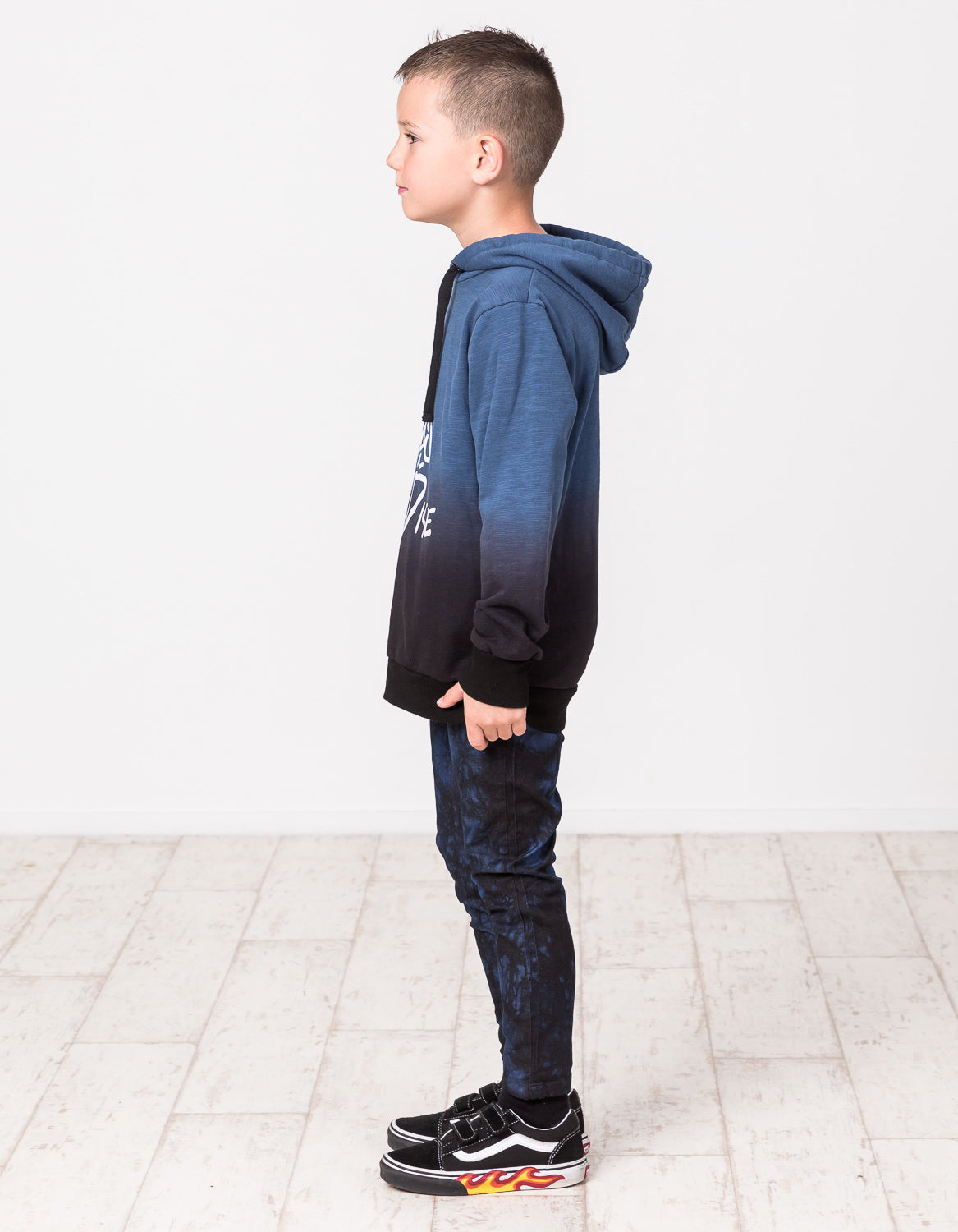 Lightweight stretch cotton denim tie dye jean with elasticized rib trim waist & workable drawstring ties. Slash pockets in front & tie dye ‘Rad Vibes’ print & welt pockets on rear. Blue-black tie dye wash - due to the wash process each pair is unique and may vary slightly.