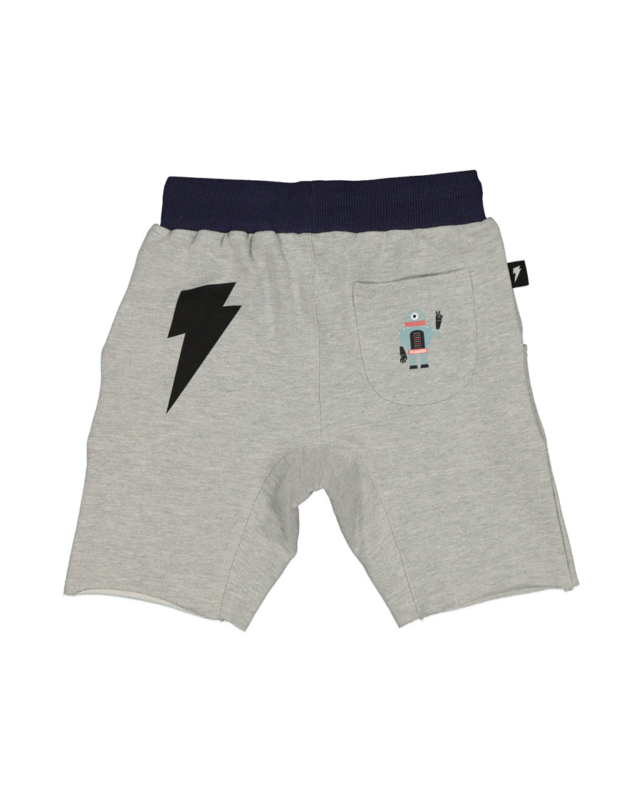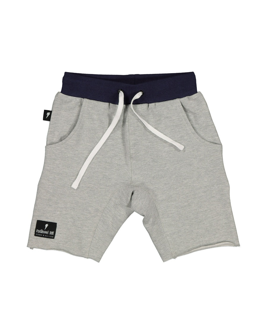 Mid-weight cotton / spandex short in grey marl with peace robot print & signature Radicool Dude bolt on reverse. Navy rib waistband with workable white ties & raw hems.
