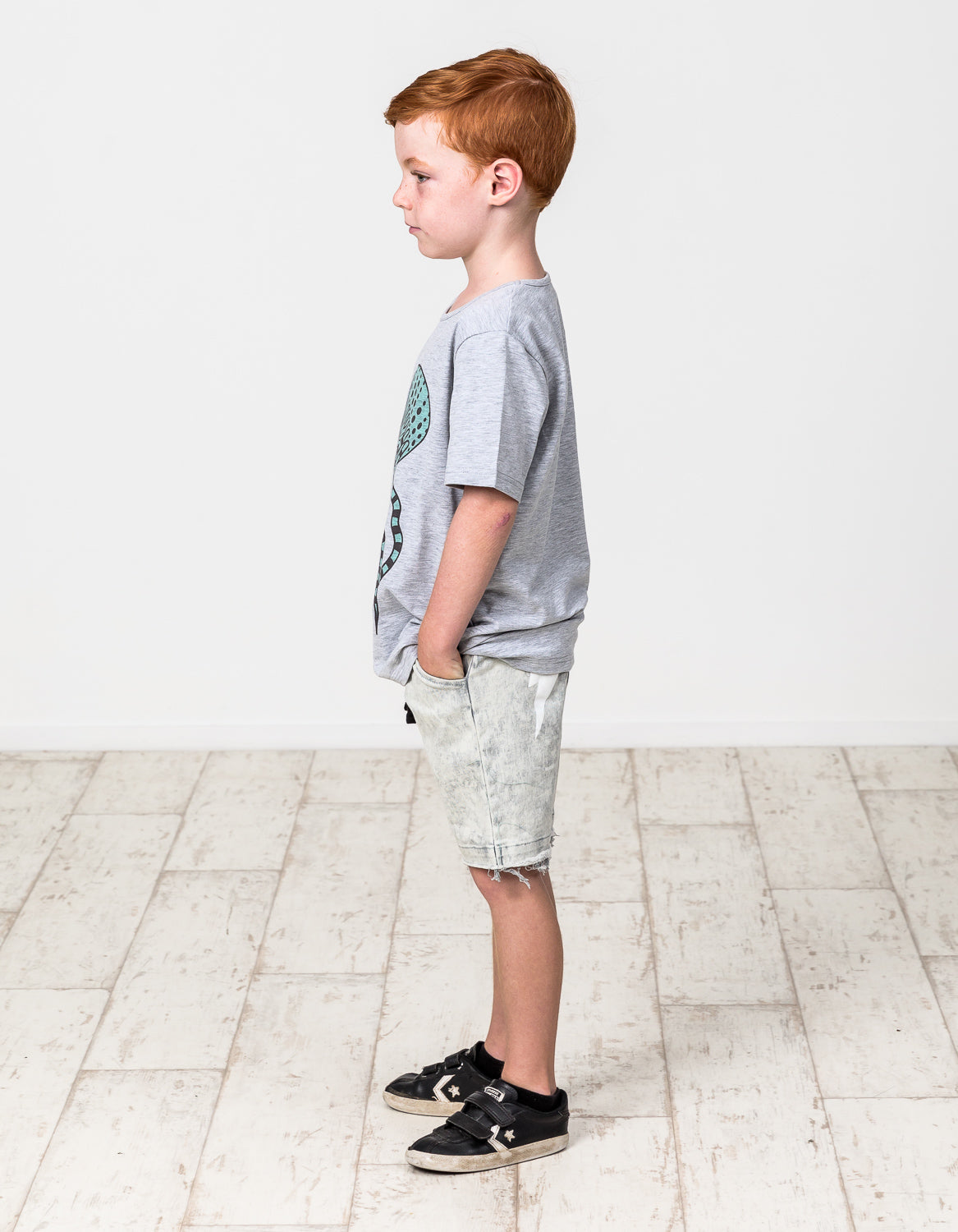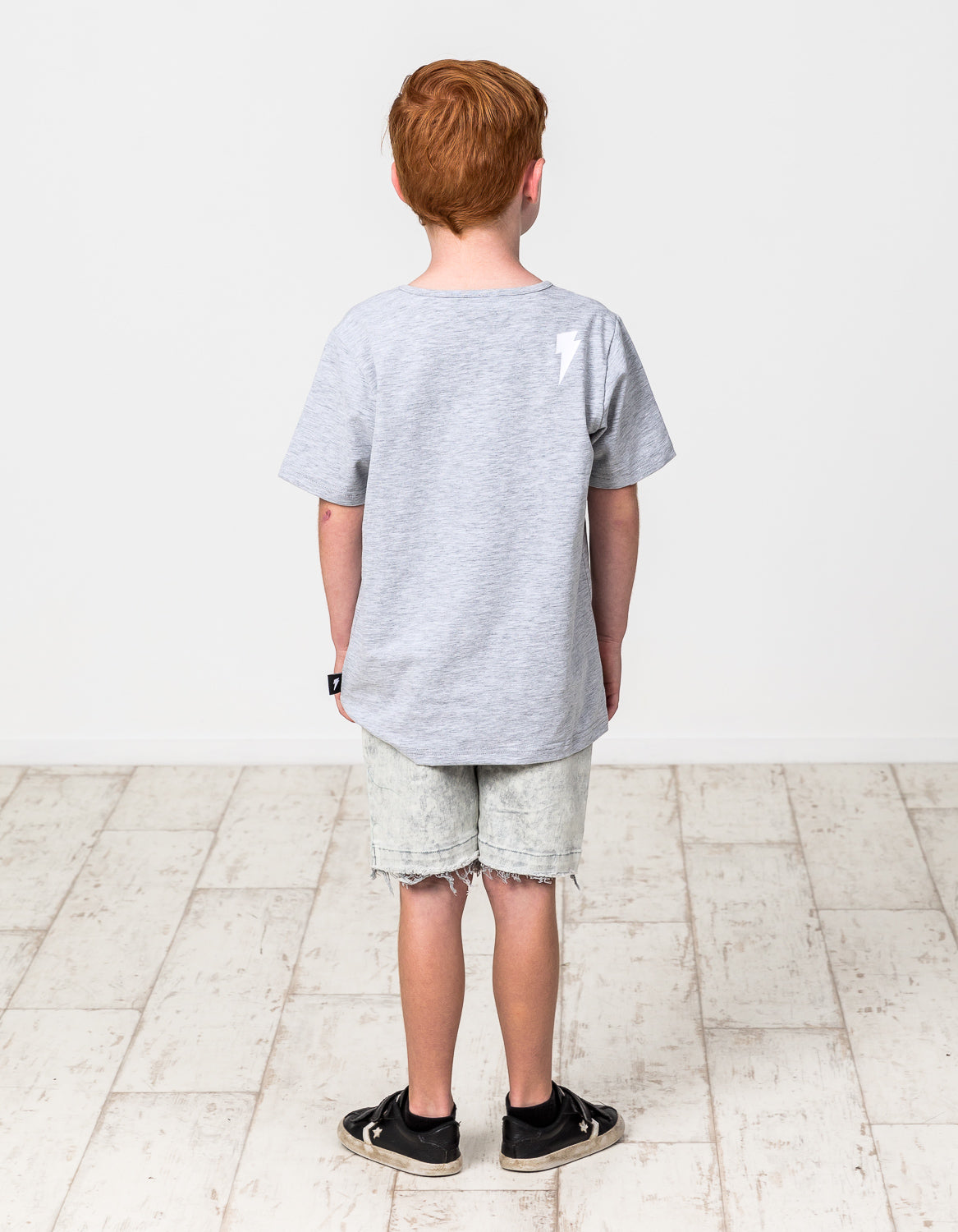 Cotton / spandex tee in grey marl with monster jellyfish print on chest & signature Radicool Dude thunderbolt on reverse.