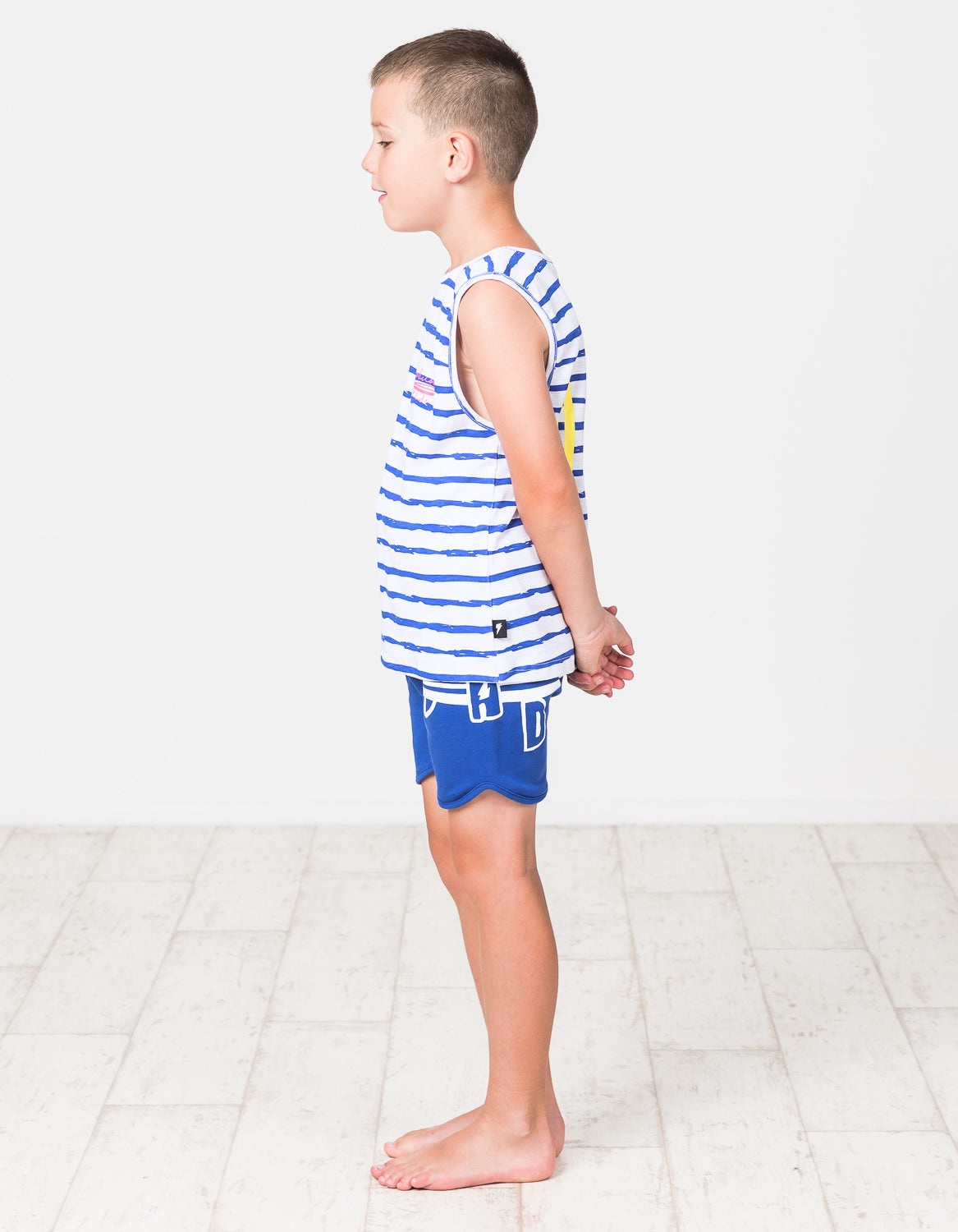 Cotton / spandex vest with cobalt wave stripe, Radicool Dude print on chest & over-sized board print in sunset neon tones on reverse. A new style with deeper armhole than the Radicool Dude tank, guaranteed to keep your grom cool.