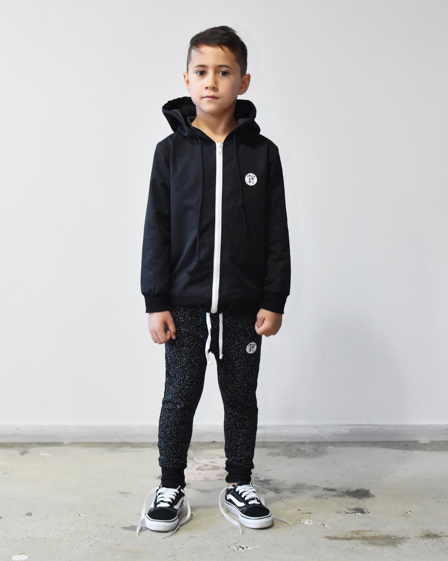 Basic, skinny trackie with fabric fleck, black trim, rear pocket and white ties. Must have pant for your little loves. Designed for boys and girls.