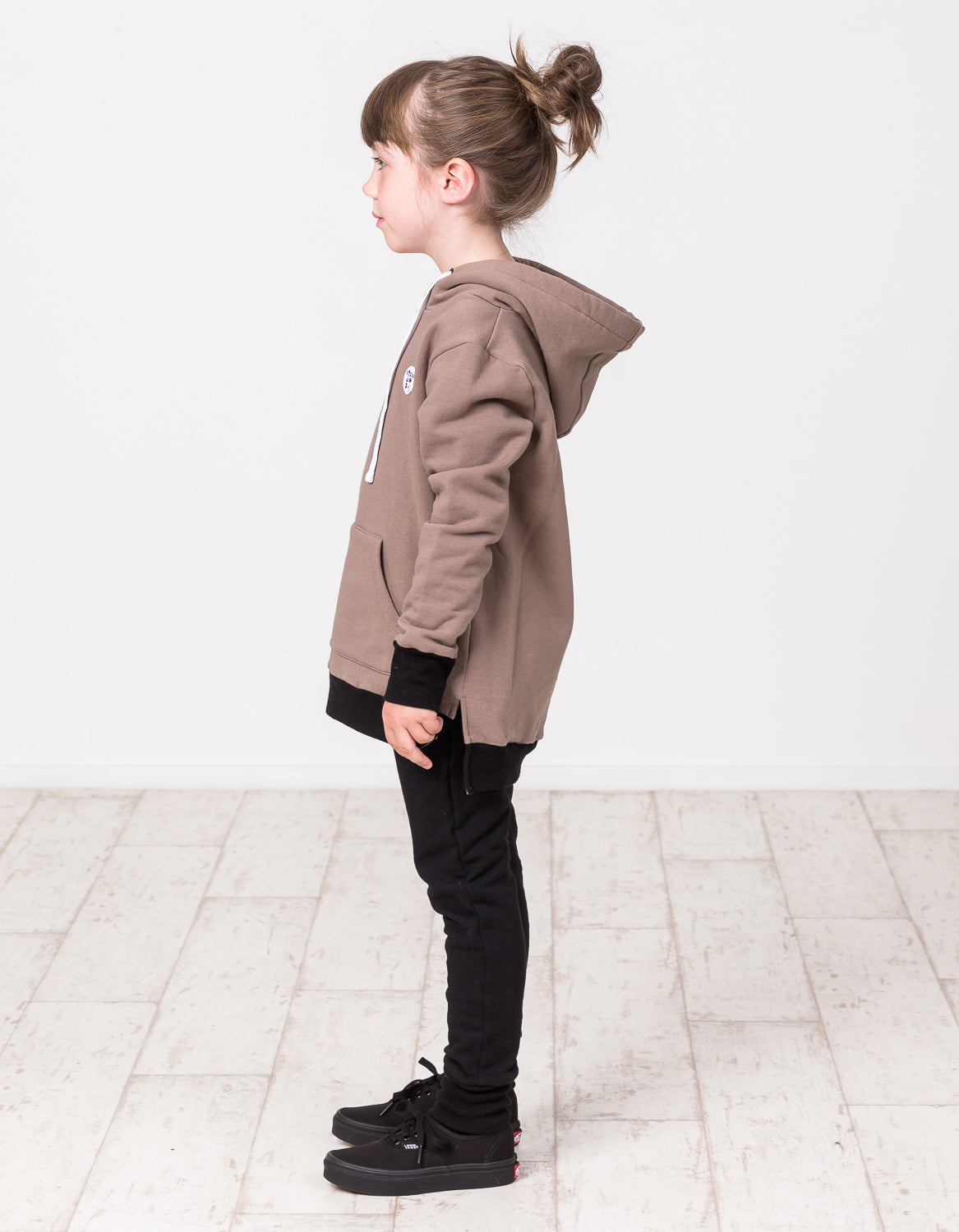 Midweight brushed cotton / spandex hood in mushroom with kangaroo pocket & contrast black trim & hood lining. Signature Rad Tribe badge on chest & split hem.