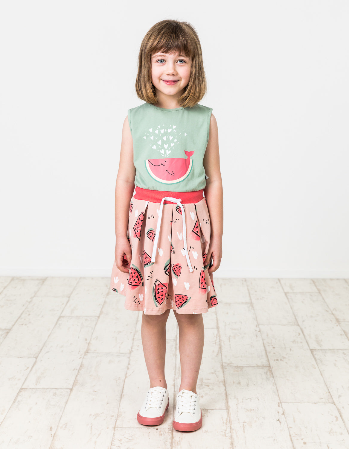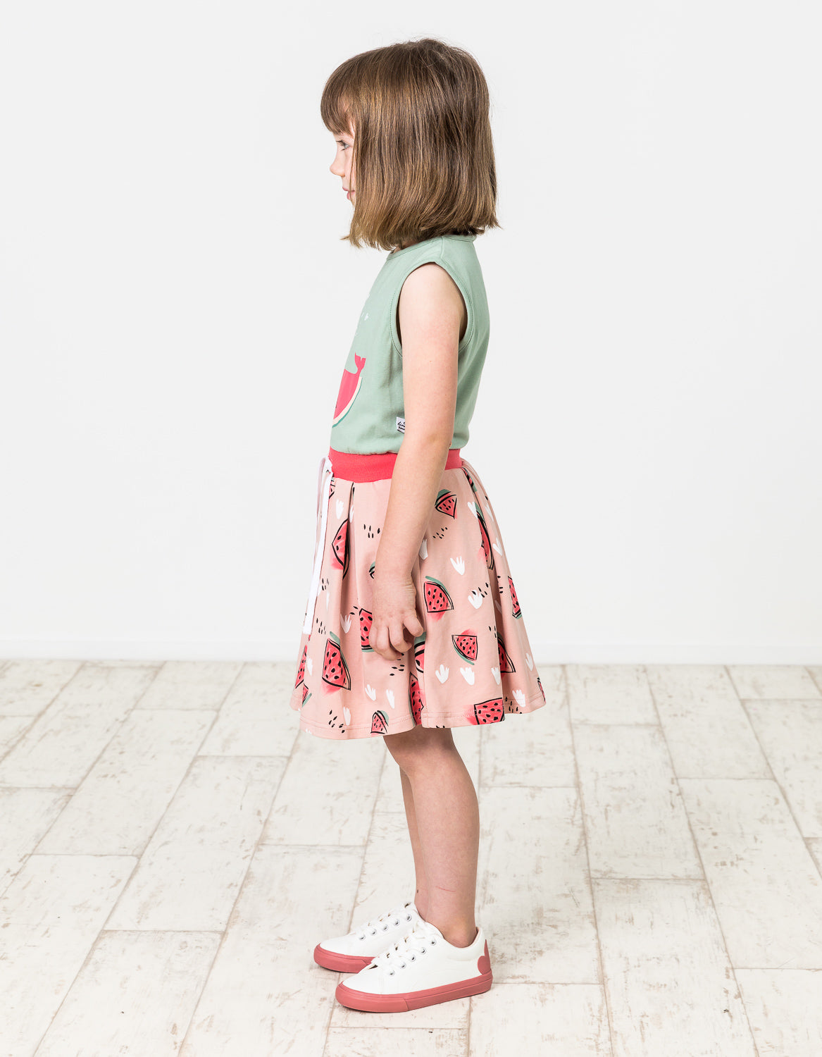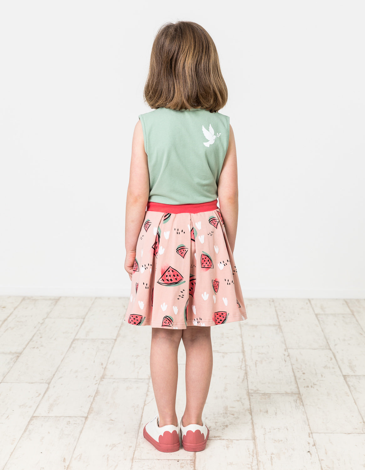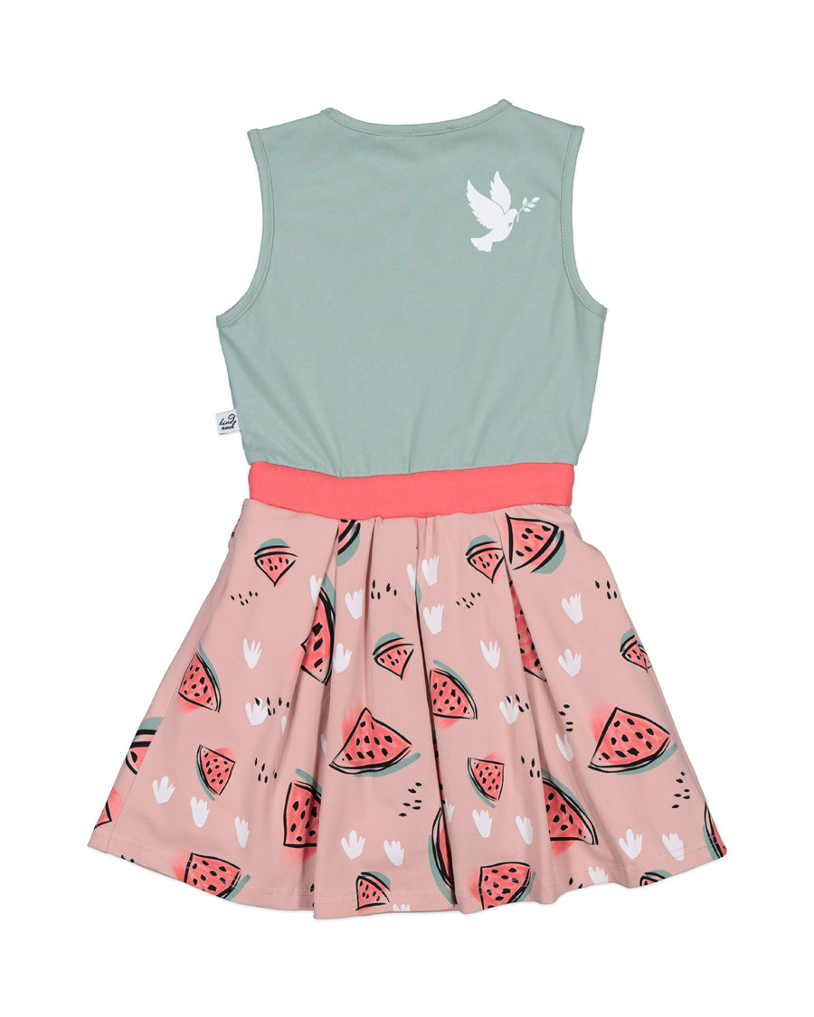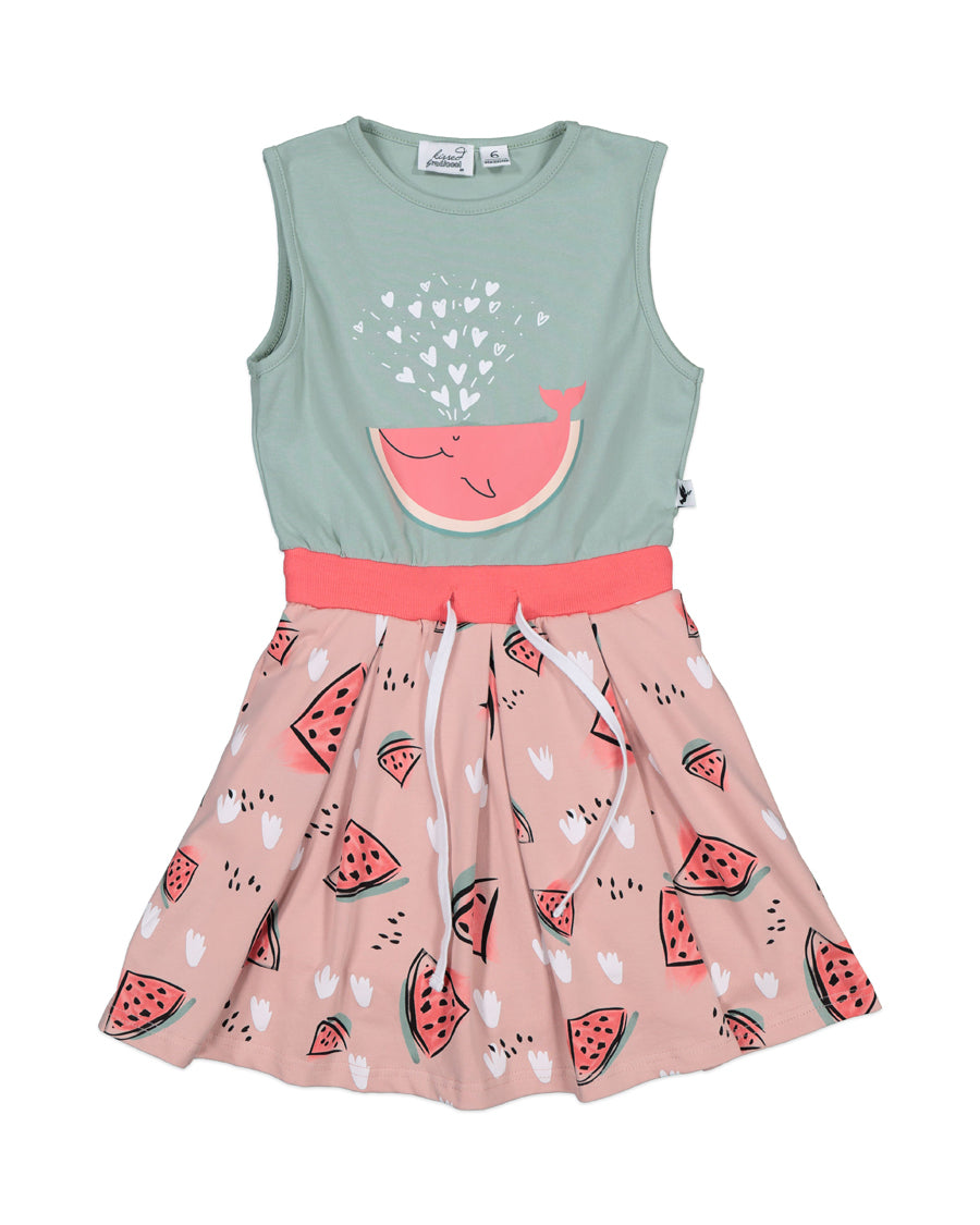 Cotton / spandex tank dress. Sage green tank top with oversized watermelon whale print with contrasting full skirt in pink with watermelon print.