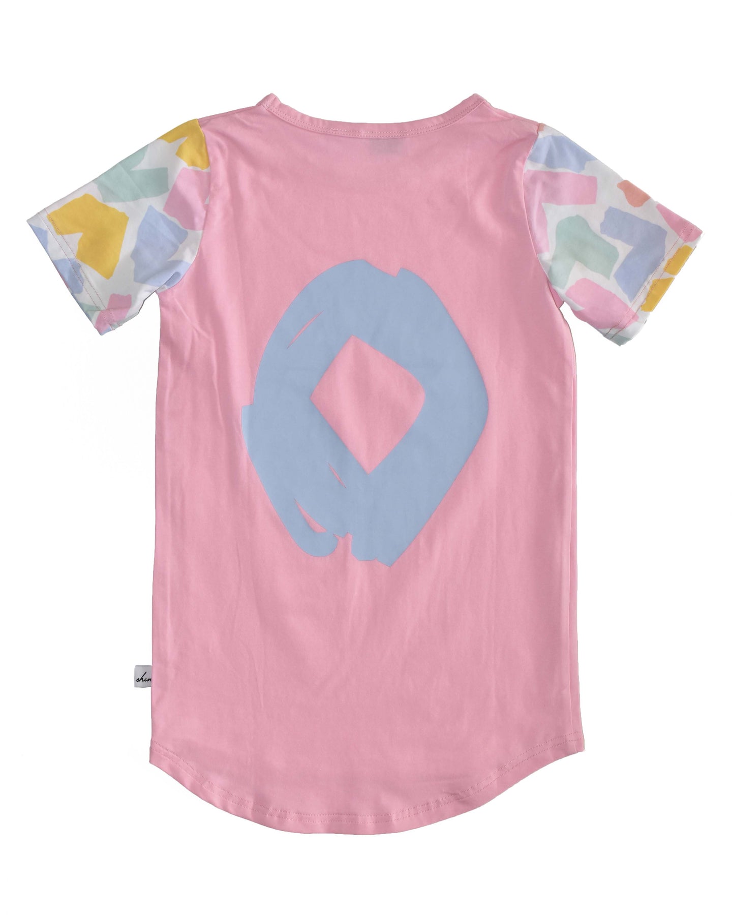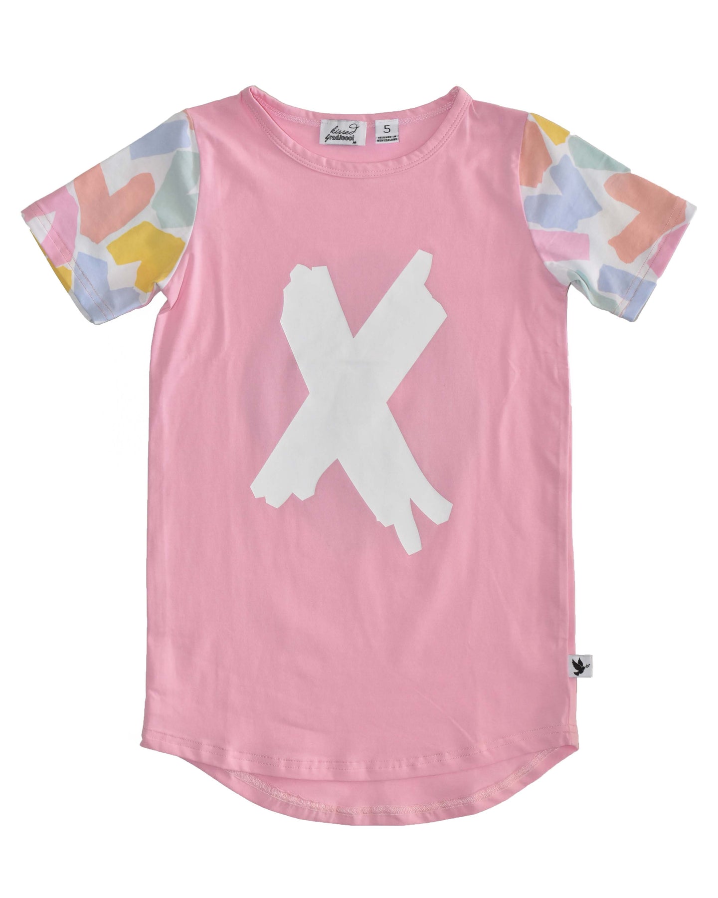 Cotton / spandex tee dress in bubblegum pink with contrasting pastel love heart print short sleeves. One of Kissed by Radicool’s most beloved styles with an oversized X&O print on front & reverse.