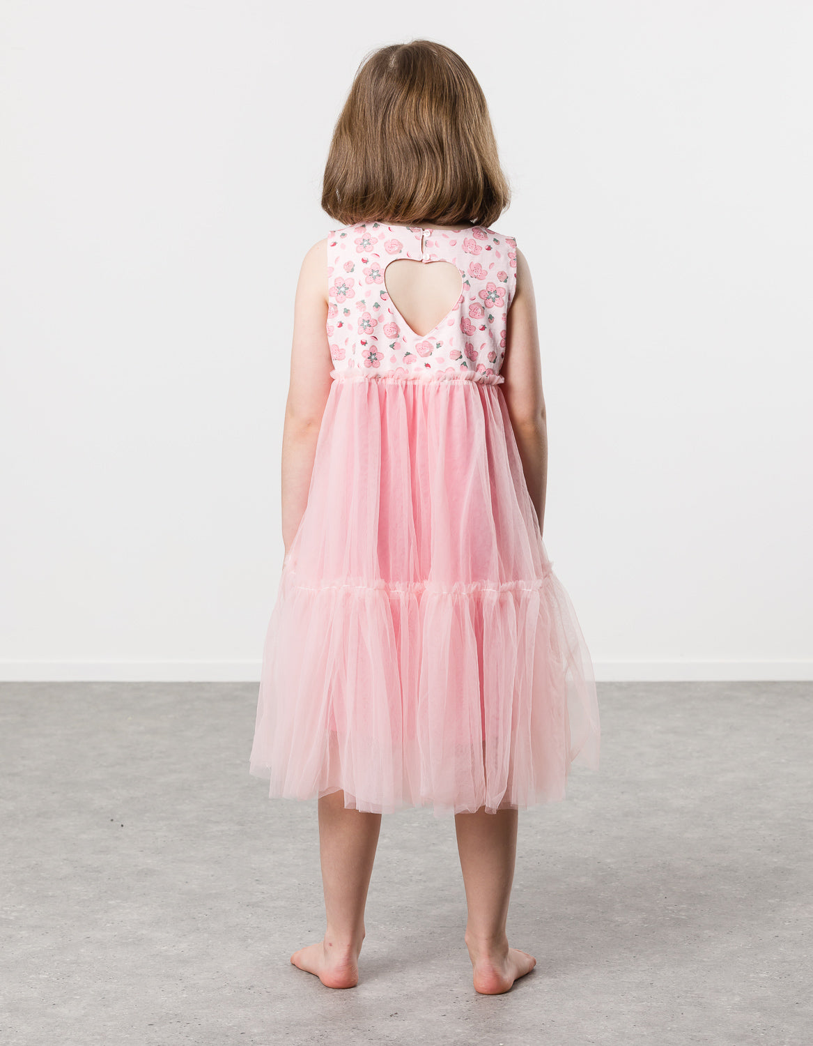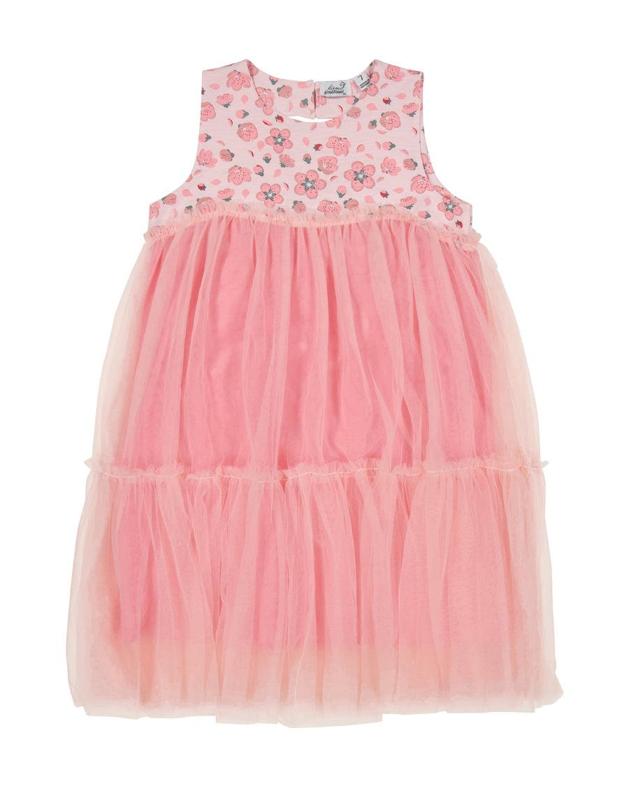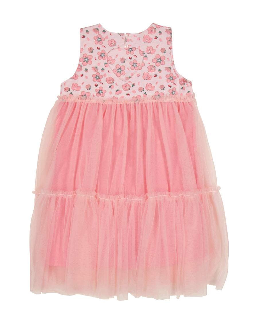 Cotton / spandex tank top in pale pink slub with all-over cherry blossom print. Love-heart keyhole at back & tiered tulle skirt in pale pink.  The ultimate party dress this spring for your wee princess!