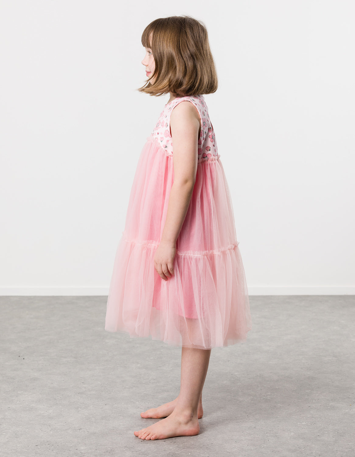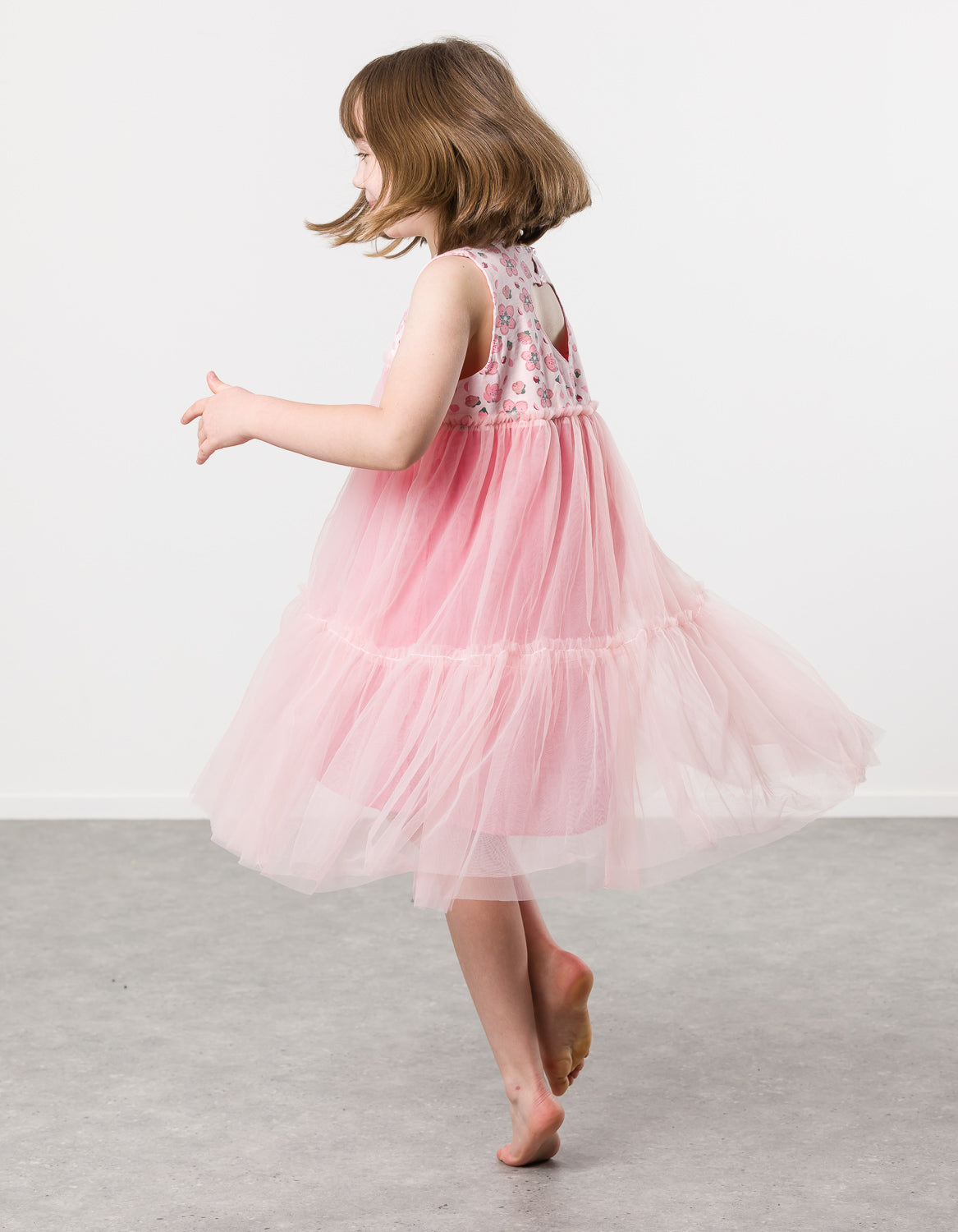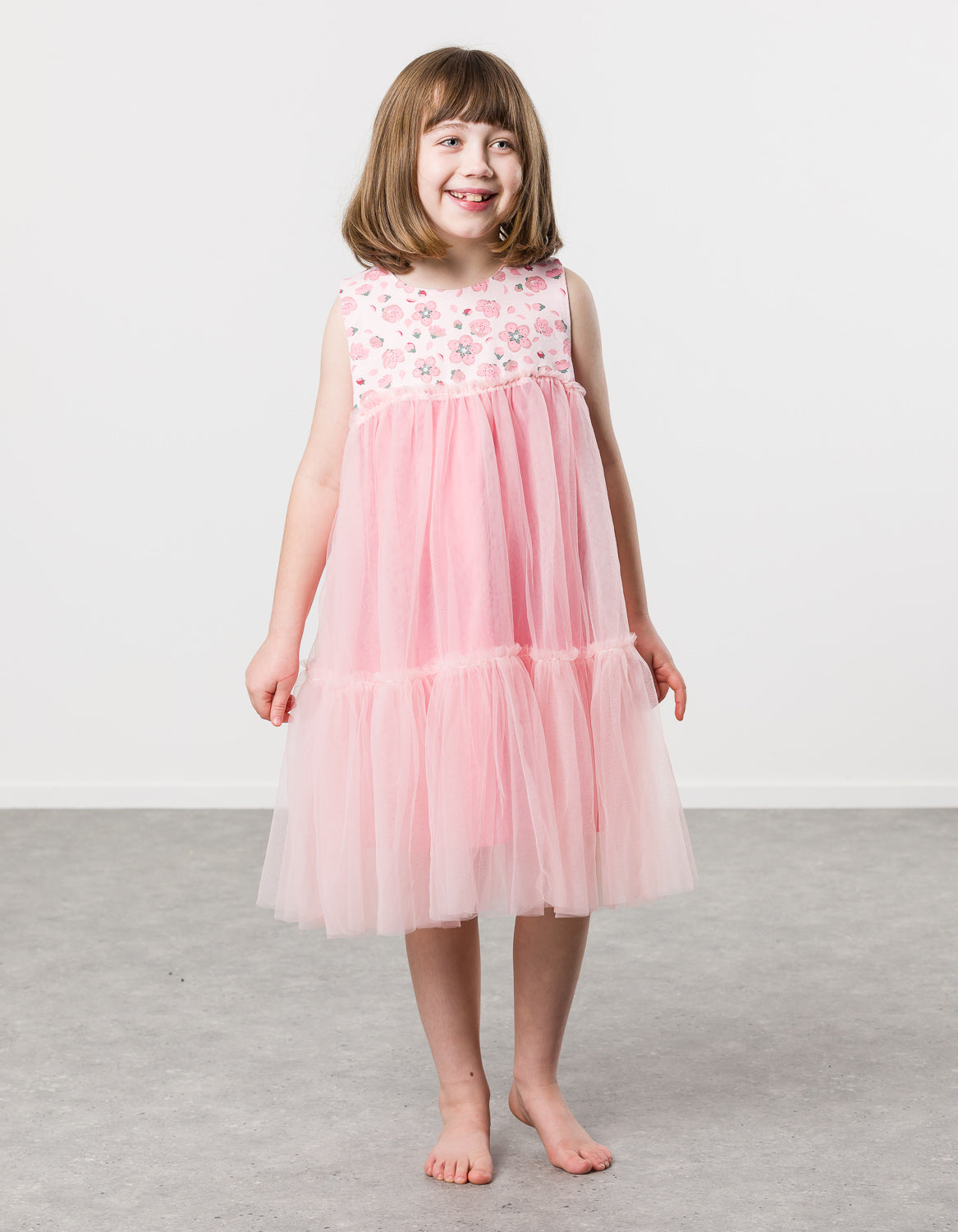 Cotton / spandex tank top in pale pink slub with all-over cherry blossom print. Love-heart keyhole at back & tiered tulle skirt in pale pink.  The ultimate party dress this spring for your wee princess!