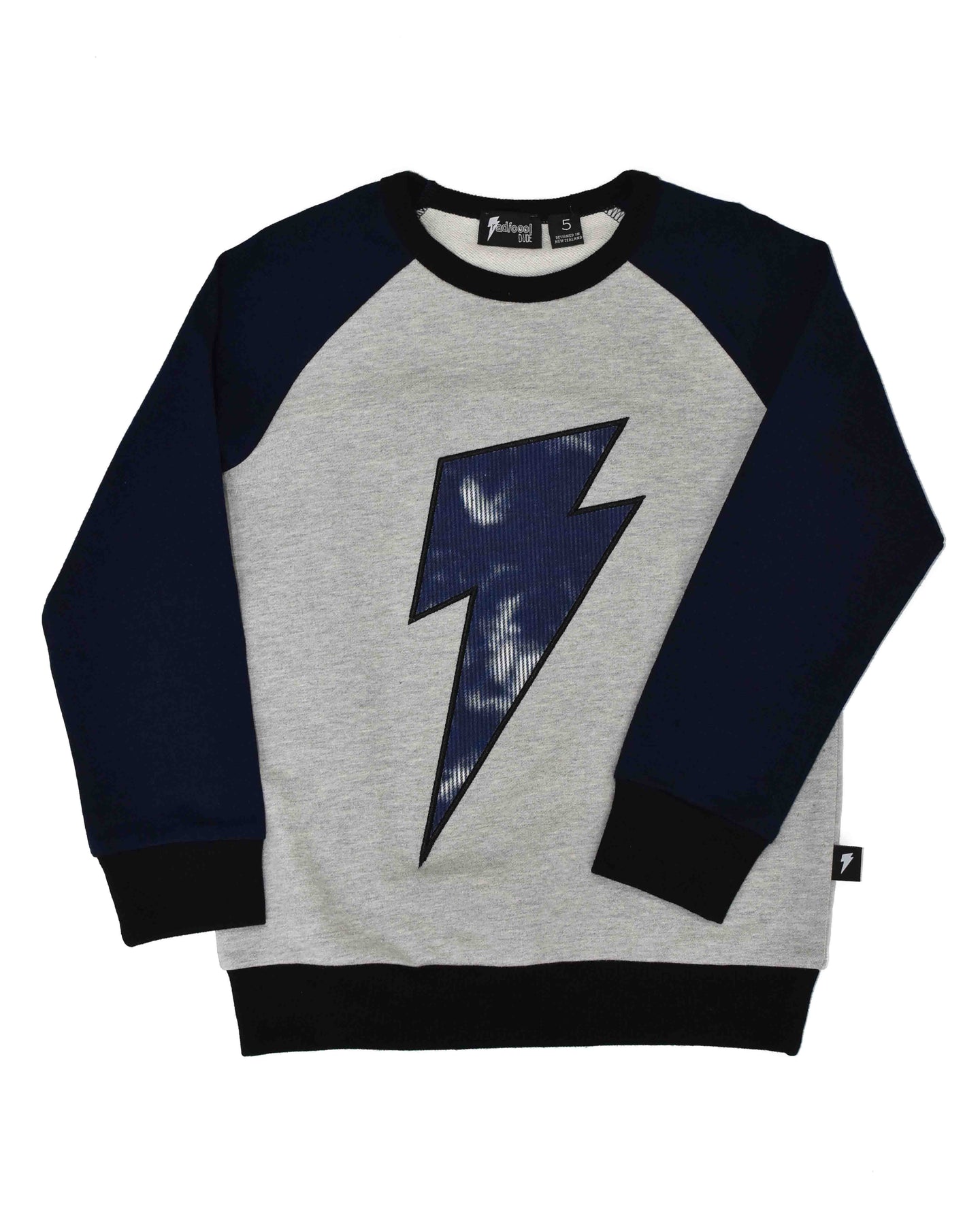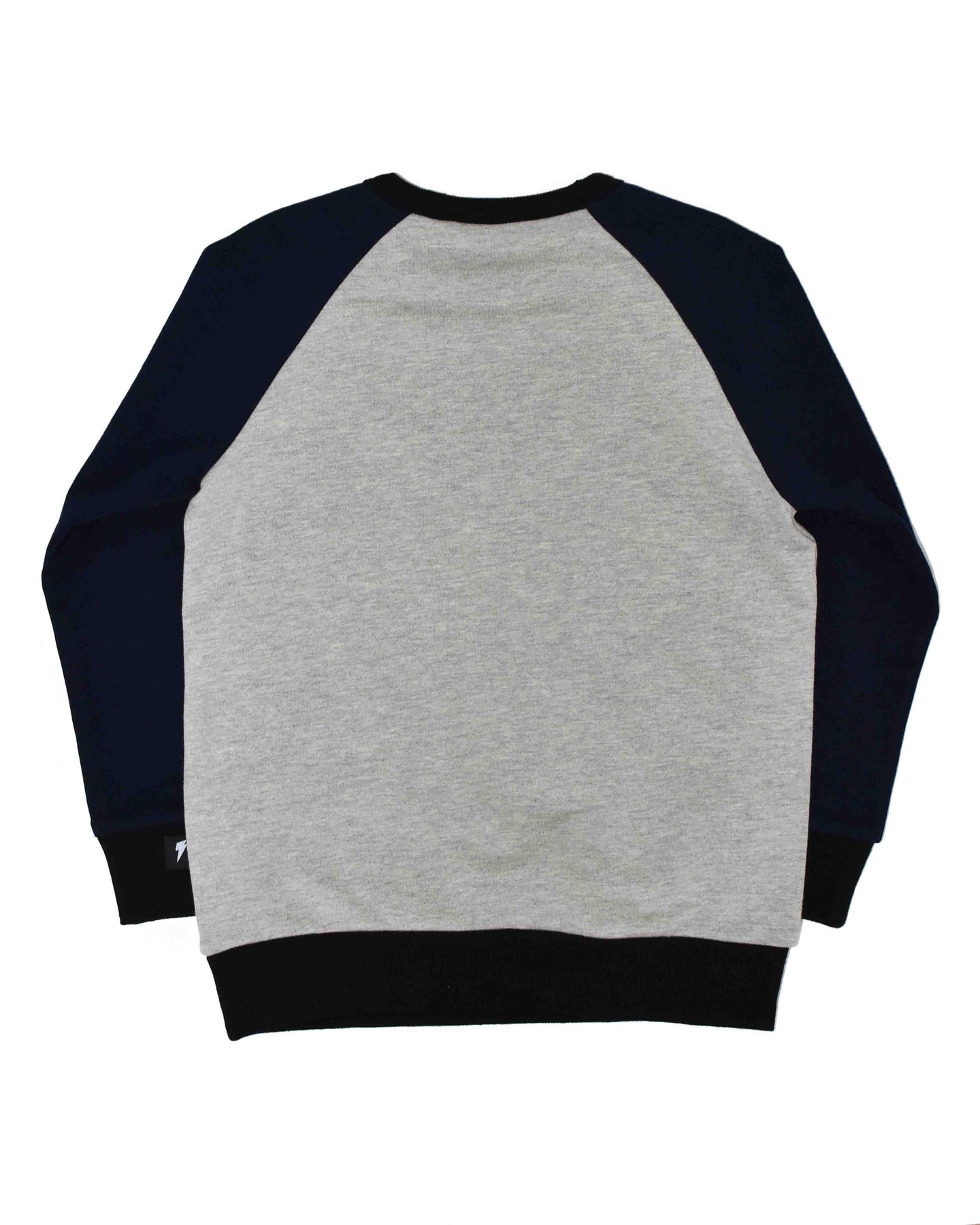 260GSM COTTON/SPANDEX RAGLAN SLEEVE CREW WITH CONTRAST SLEEVES AND EMBROIDERED FRONT THUNDERBOLT. DEEP NAVY SLEEVE/BLACK TRIM/GREY BODY