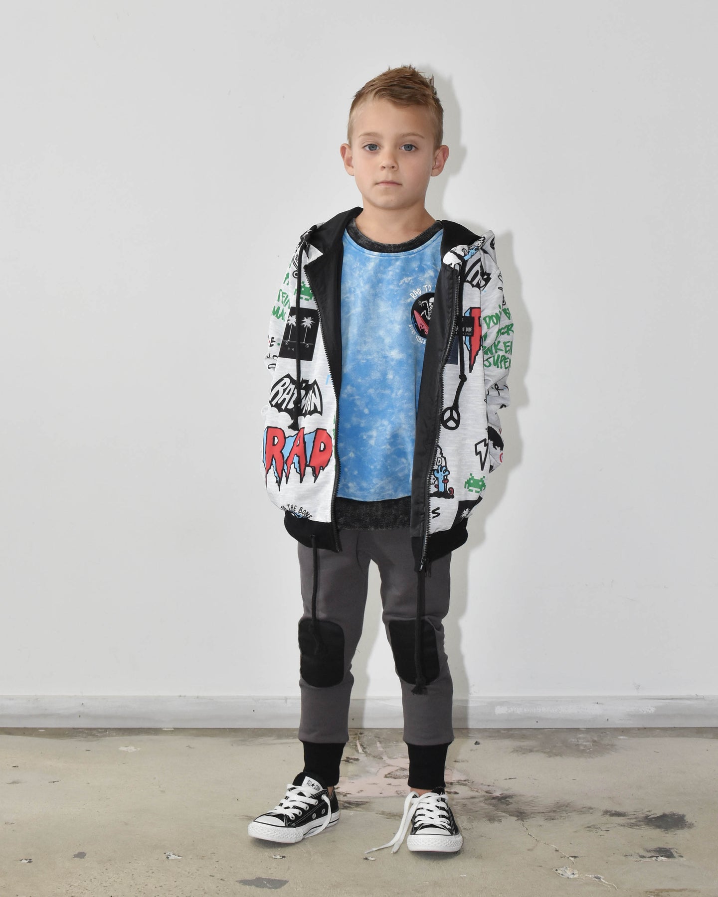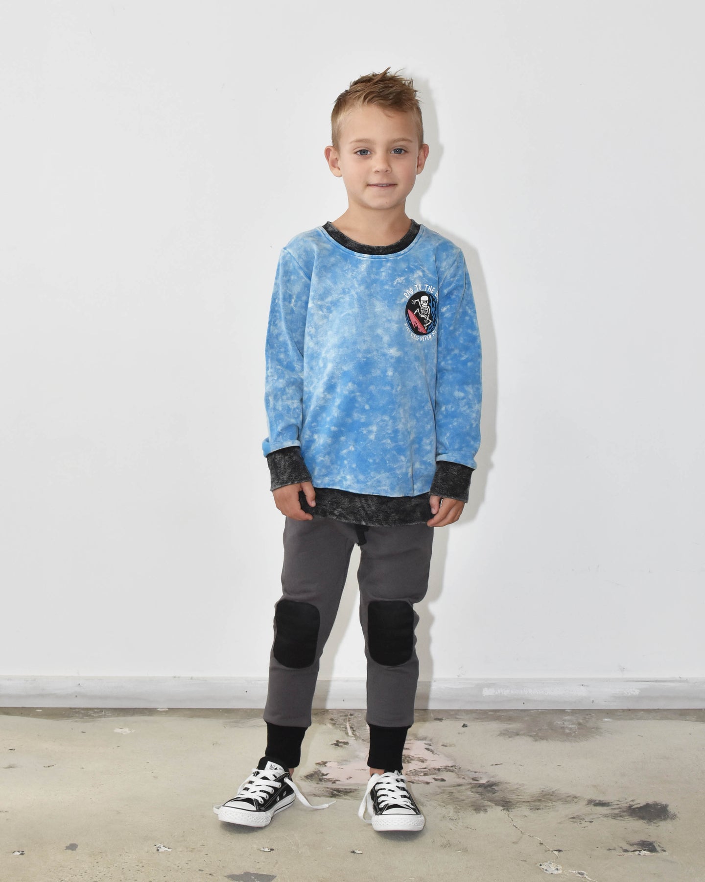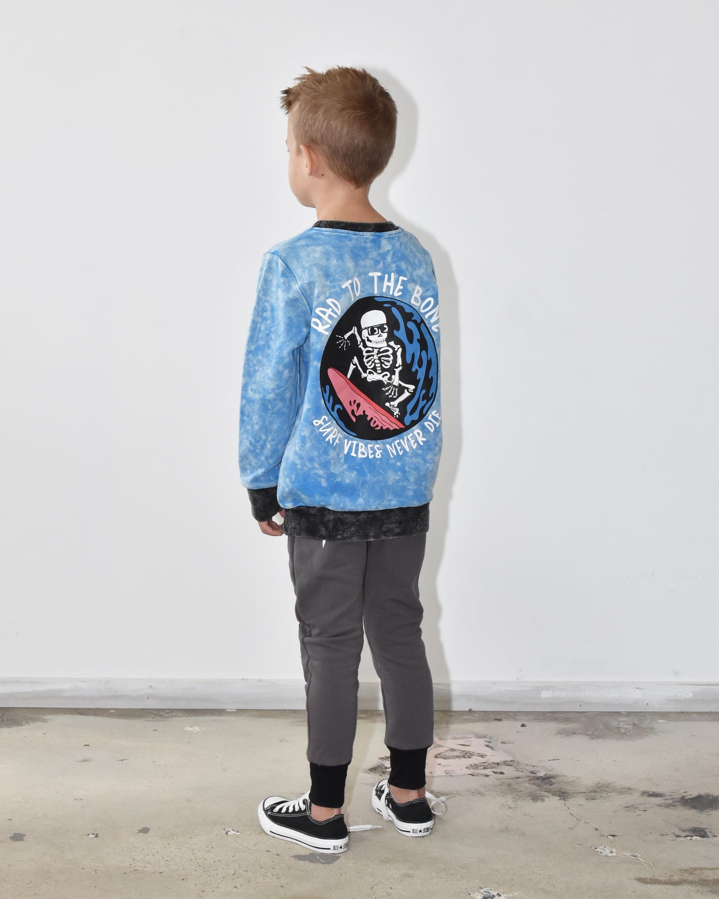 220gsm cotton/spandex, enzyme wash crew with chest print and large back Rad vibes never die skeleton print on rear This crew is an epic blue with an enzyme wash throughout making each one unique. Rad to the bone chest print and large back print. Black trims are also enzyme washed giving it a vintage feel.