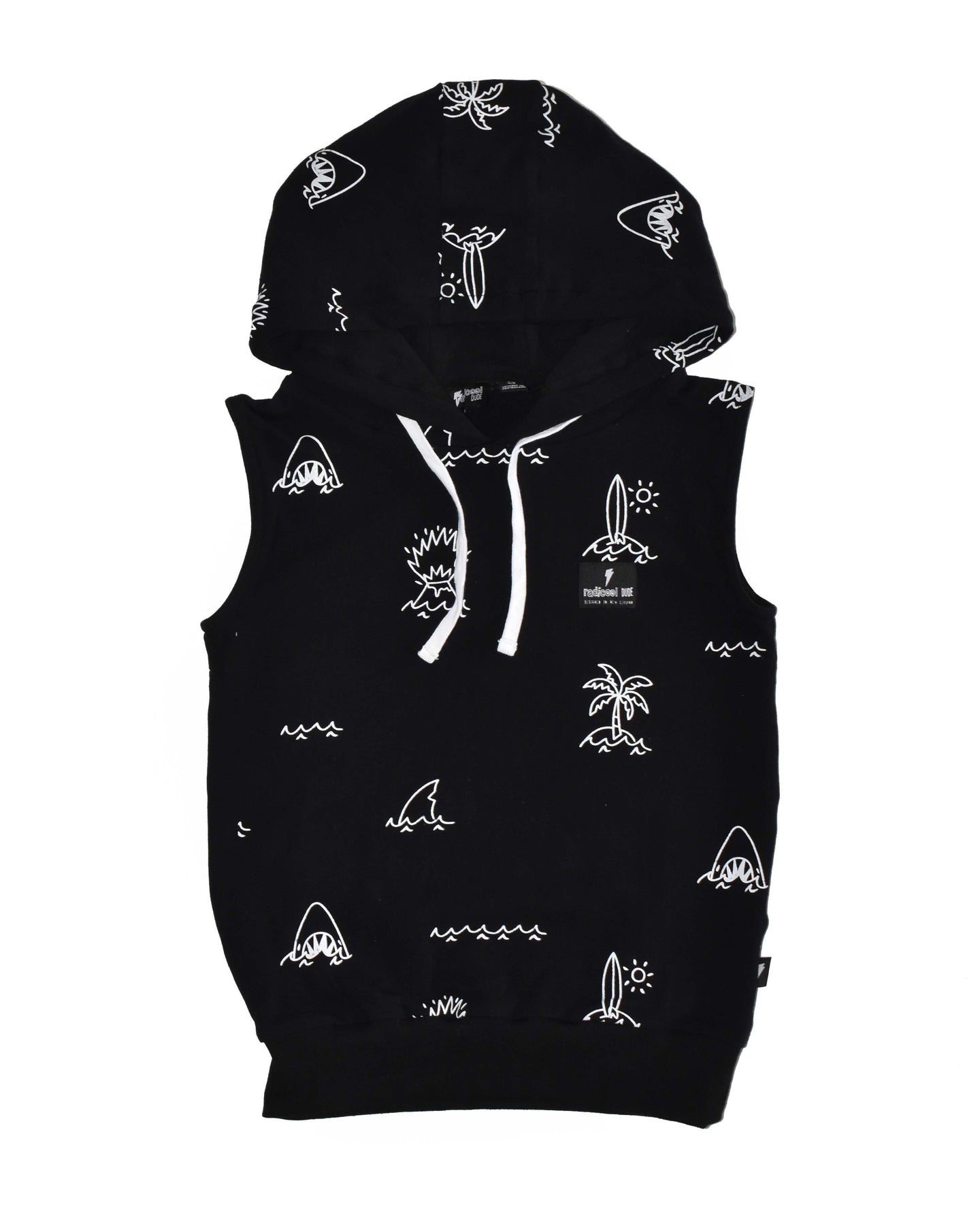 Mid-weight cotton / spandex sleeveless hood in black & workable drawstring ties. Radicool Dude island life print in white.