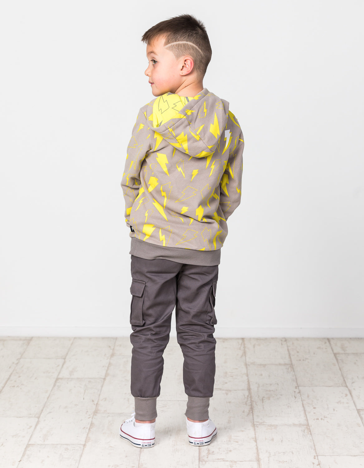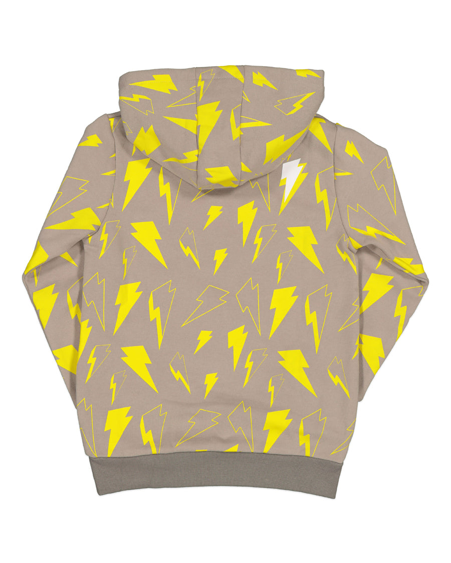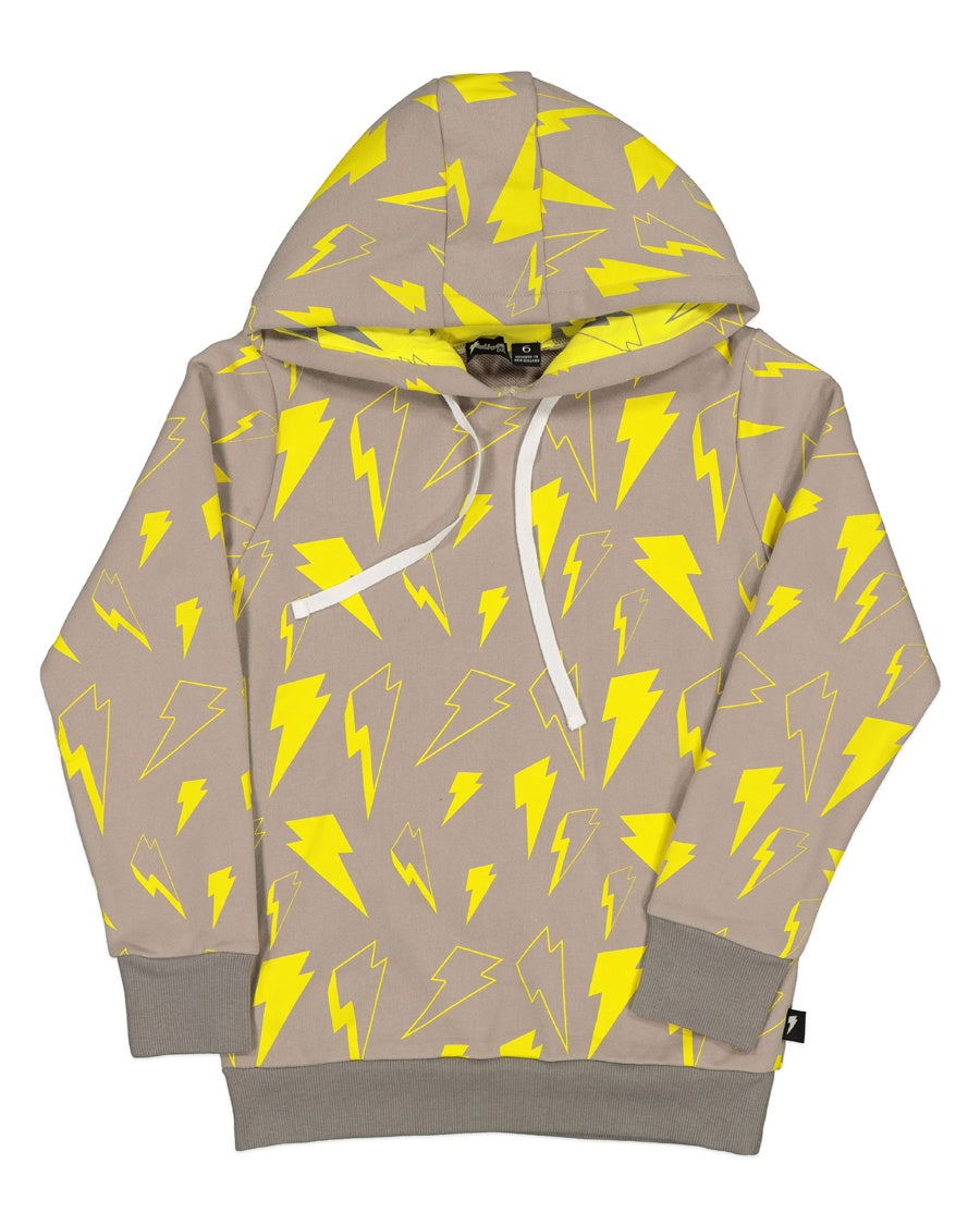 Brushed cotton / spandex pullover hood in greige with all-over neon yellow bolt print & cosy in-seam pockets. The perfect trans-seasonal piece in a practical autumnal shade with a signature pop of Radicool colour!