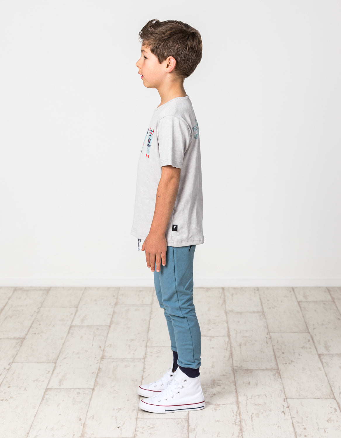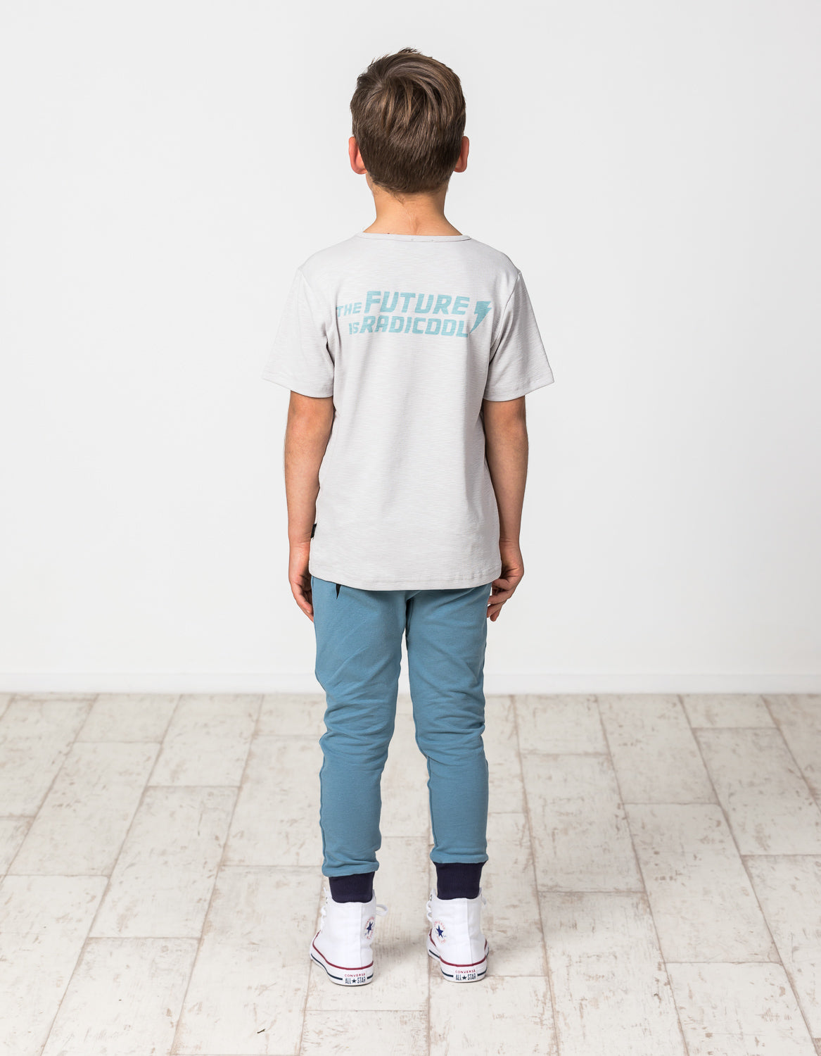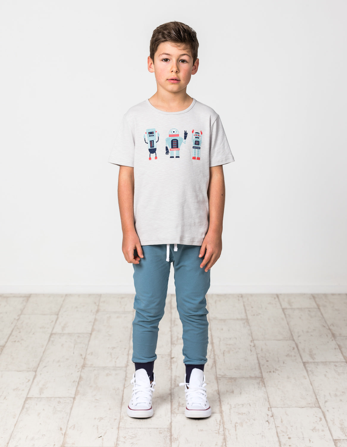 Mid-weight cotton / spandex pant in light blue with contrast navy trims, robot print pocket & Signature Radicool Dude thunderbolt on reverse. Team with a Tee or layer up with the Robots Rule Crew.