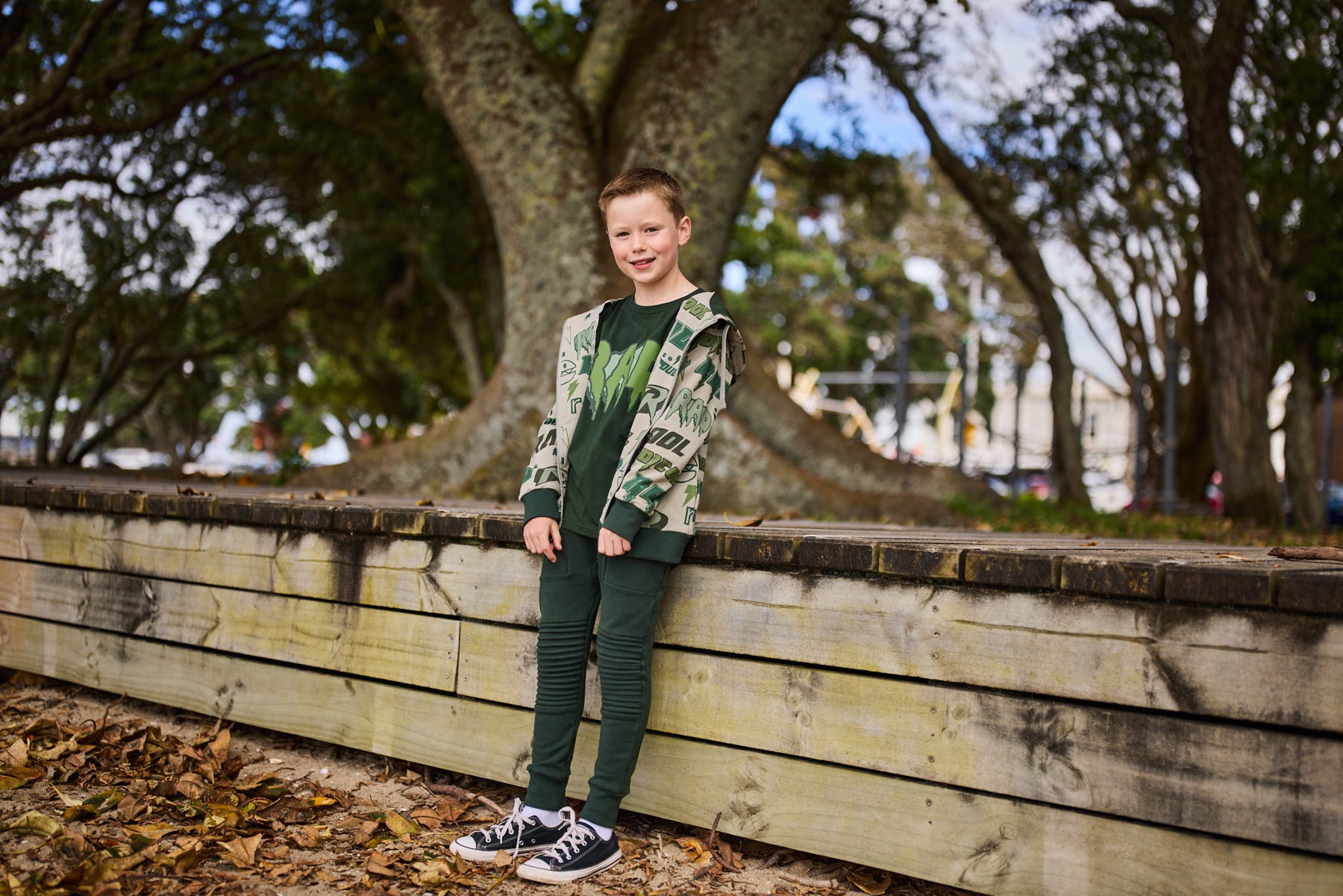 • Dark green rib trim at cuffs & waistband