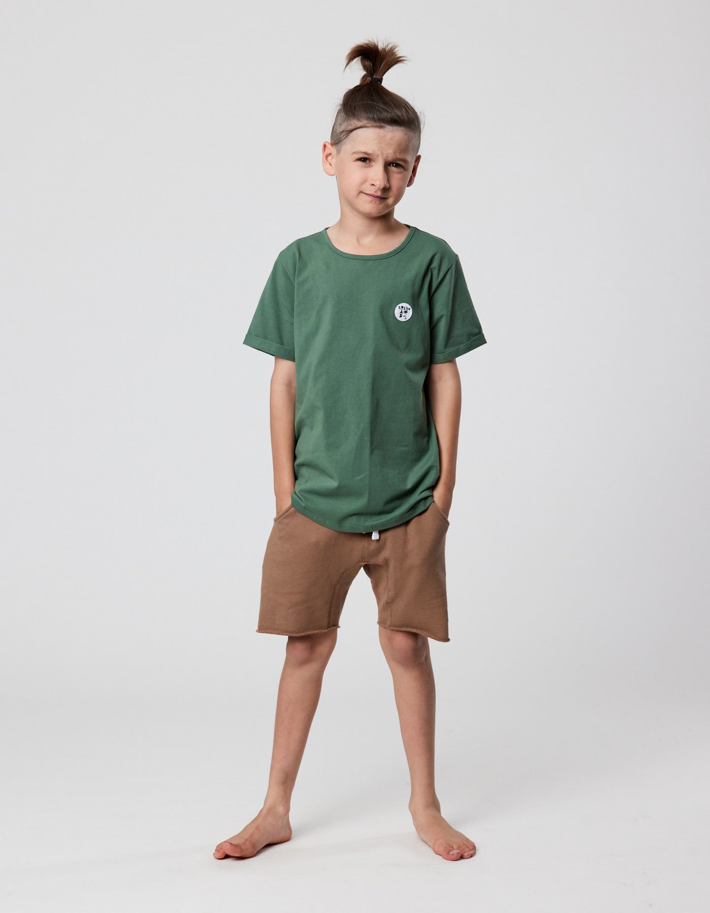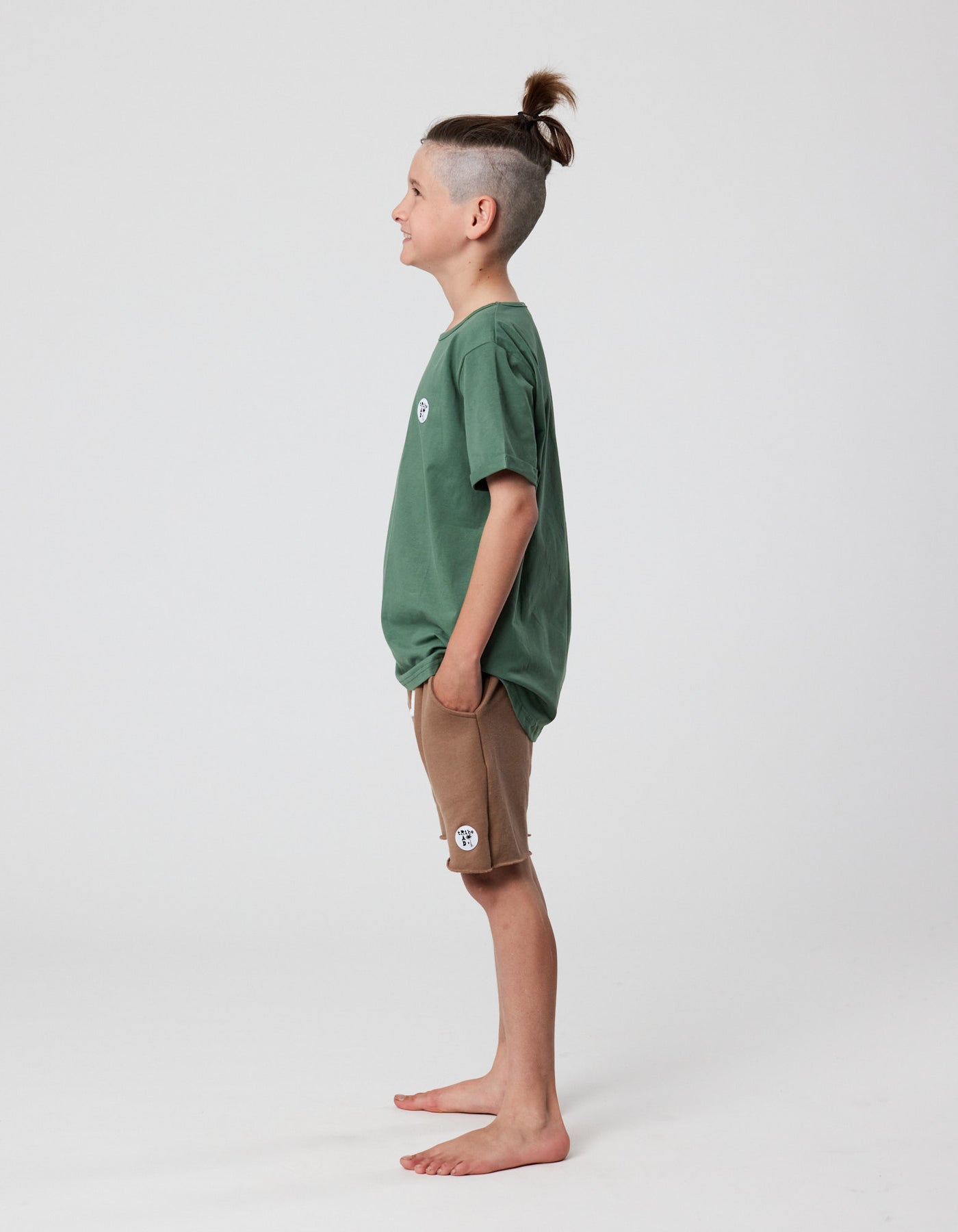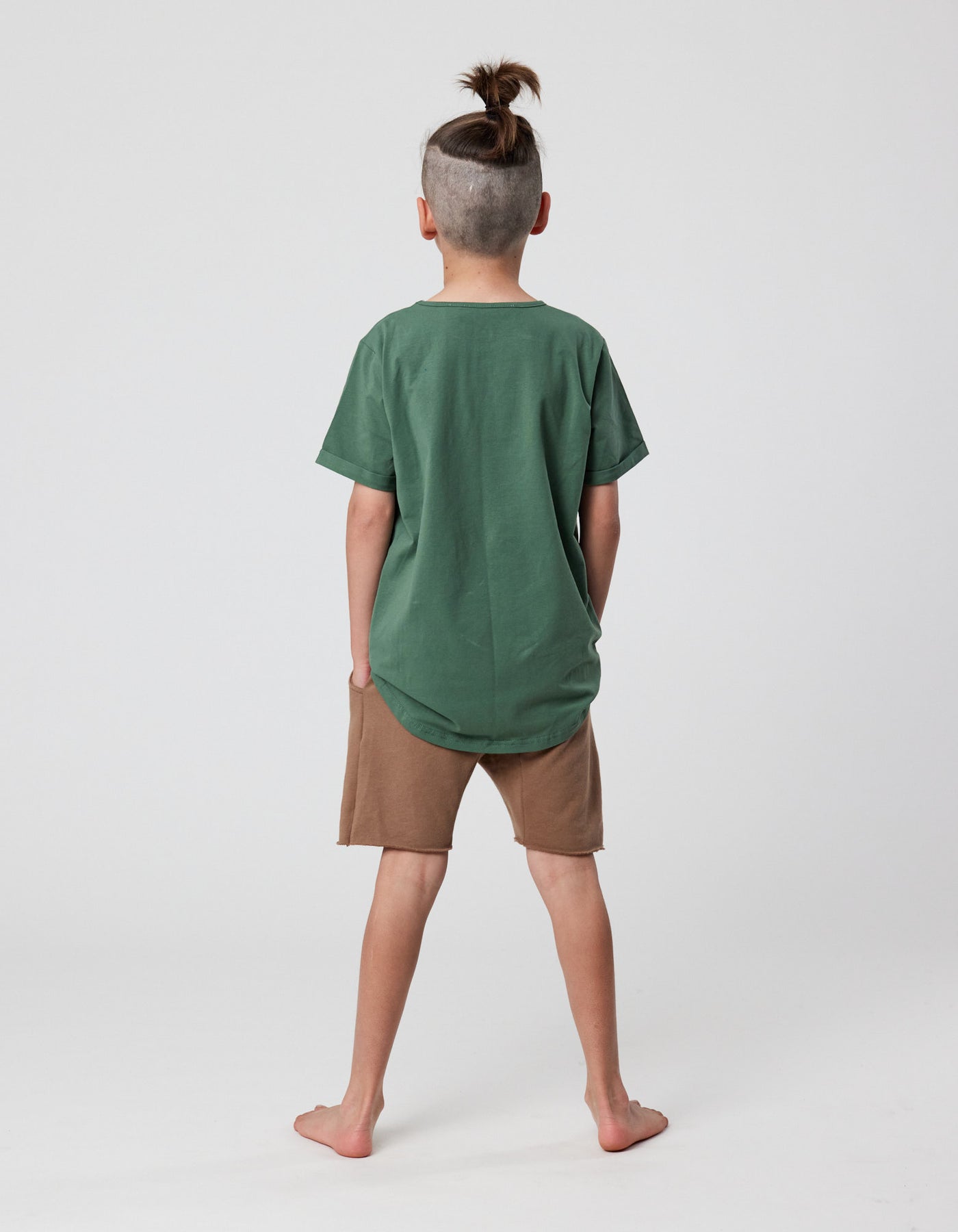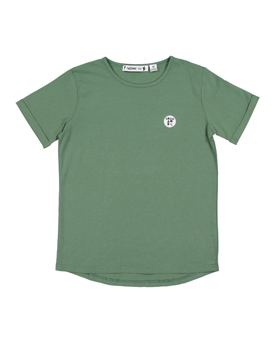 Cotton / spandex tee in green. Scoop hem style with a rolled sleeve & Rad Tribe logo badge on chest.