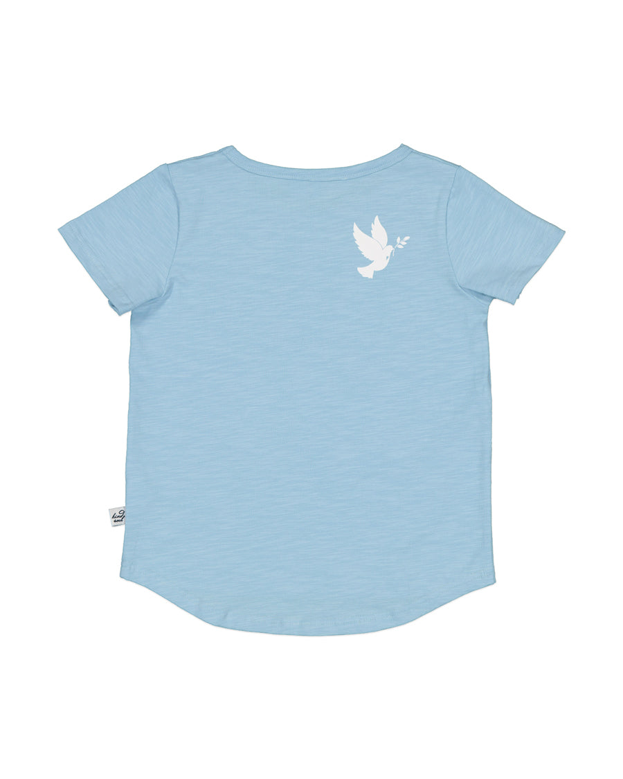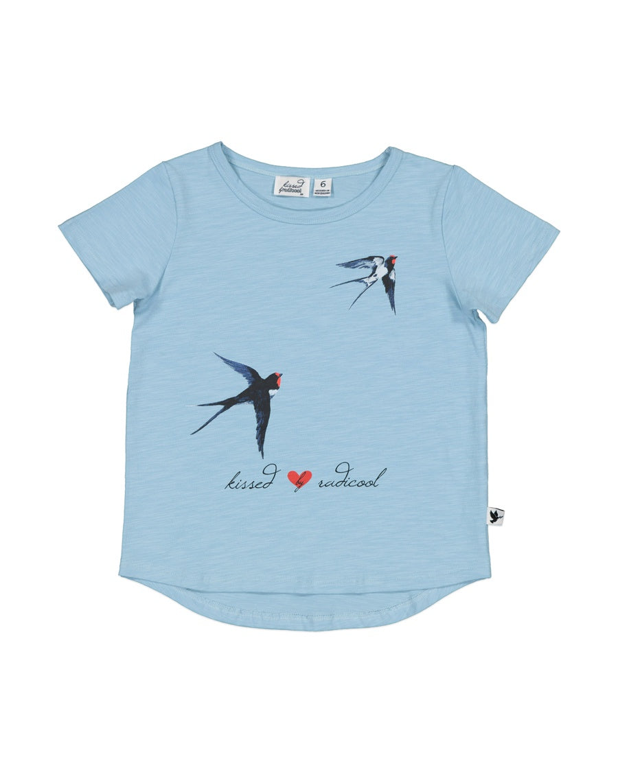 Cotton / spandex tee in sky blue with a pair of swallows print. Signature Kissed by Radicool dove in white on reverse shoulder.