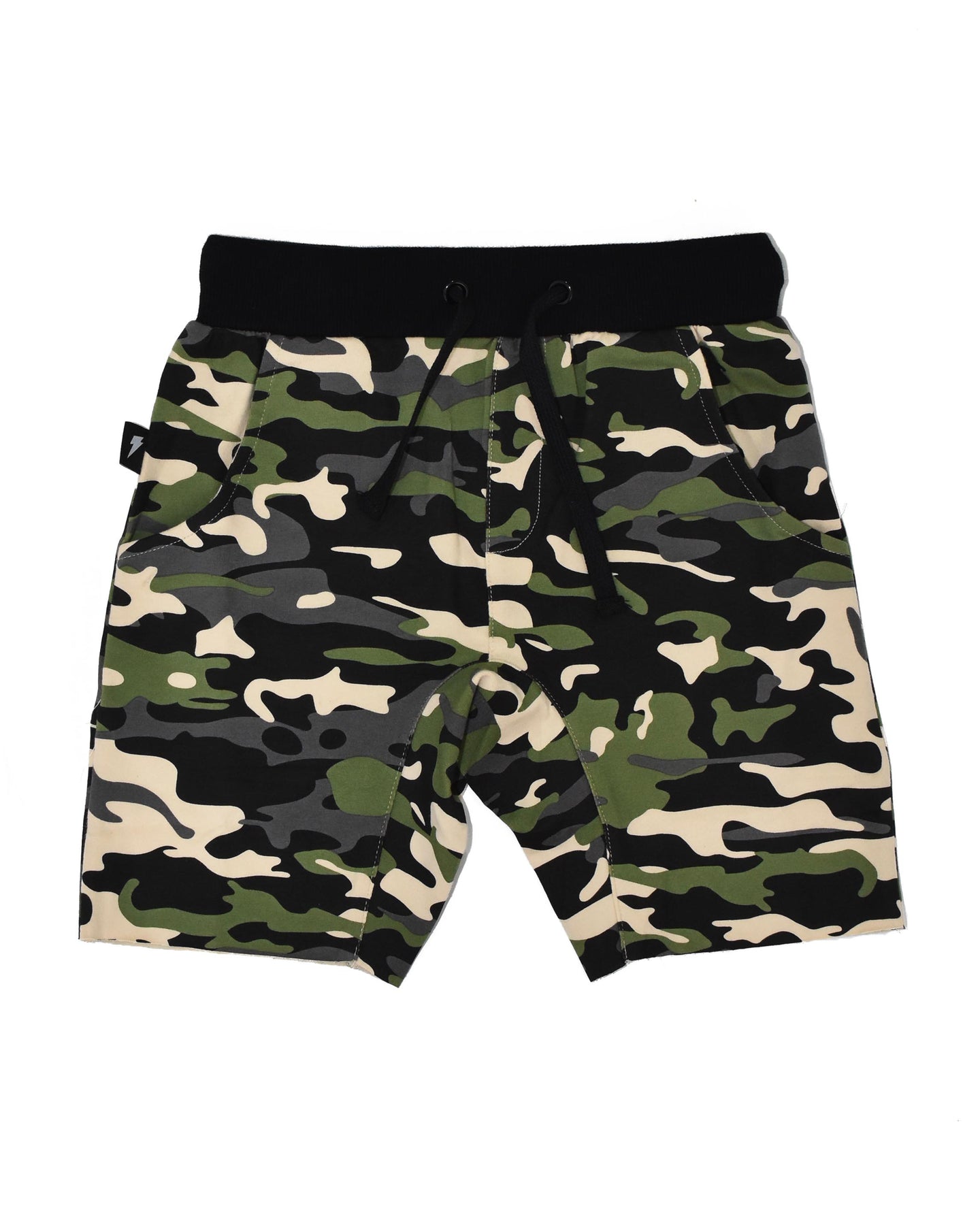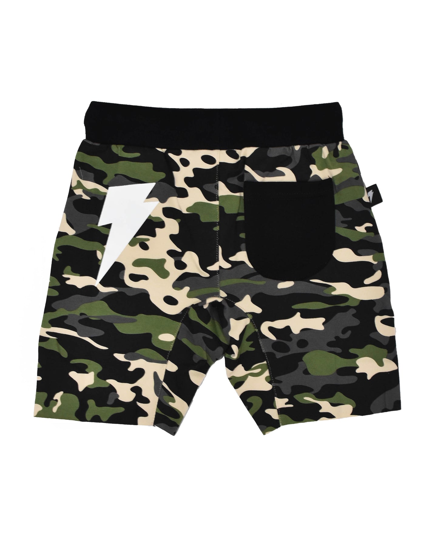 260GSM COTTON/SPANDEX SHORT WITH ALL OVER CAMO PRINT, BLACK TRIM ELASTIC WAIST WITH WORKABLE DRAWSTRING AND REAR CONTRAST POCKET