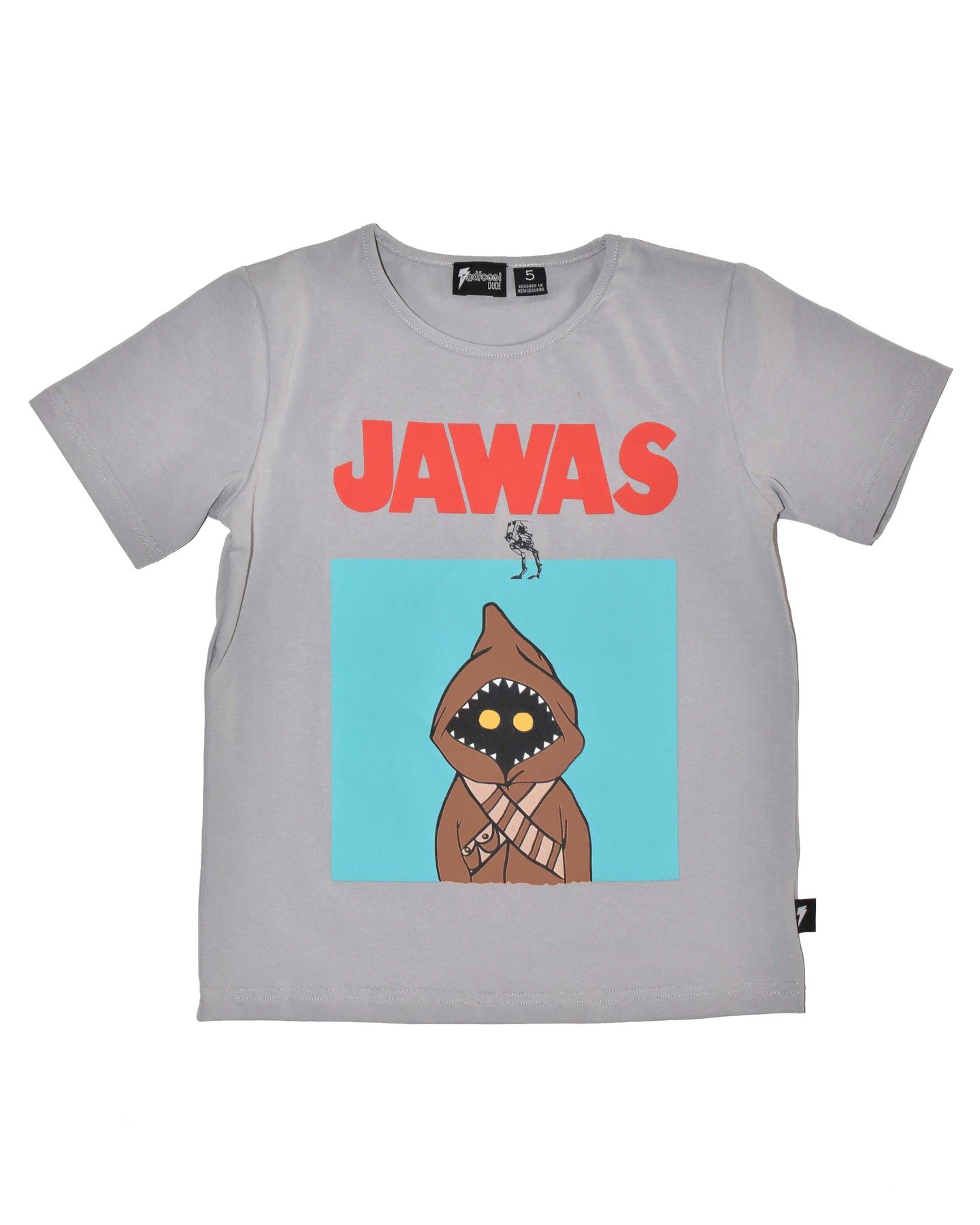 Cotton / spandex rhino-grey coloured tee with rad jawas print in turquoise & red. Signature Radicool Dude thunderbolt on reverse.