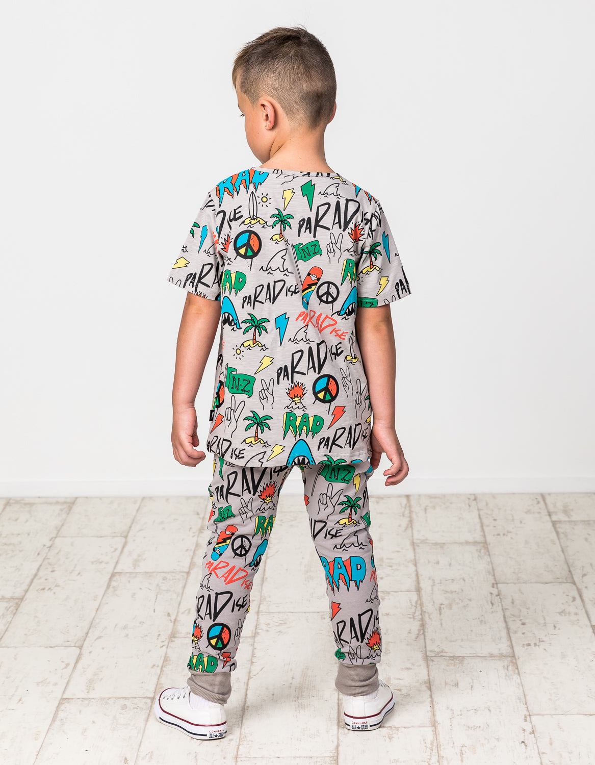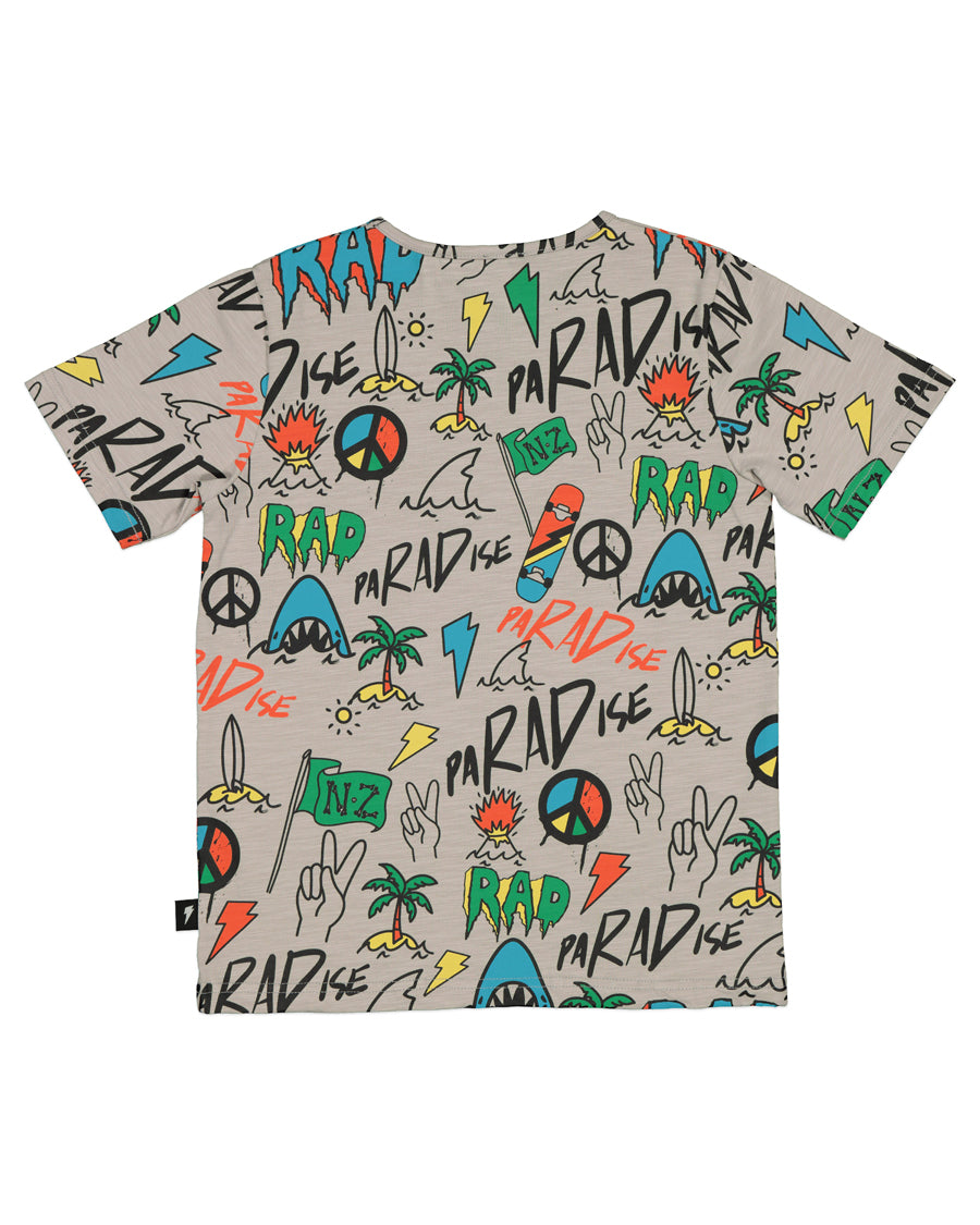 Cotton / spandex tee in greige with all-over multi-coloured Radicool Dude graffiti print. Your little one is guaranteed to stand out from the crowd in this colourful print.