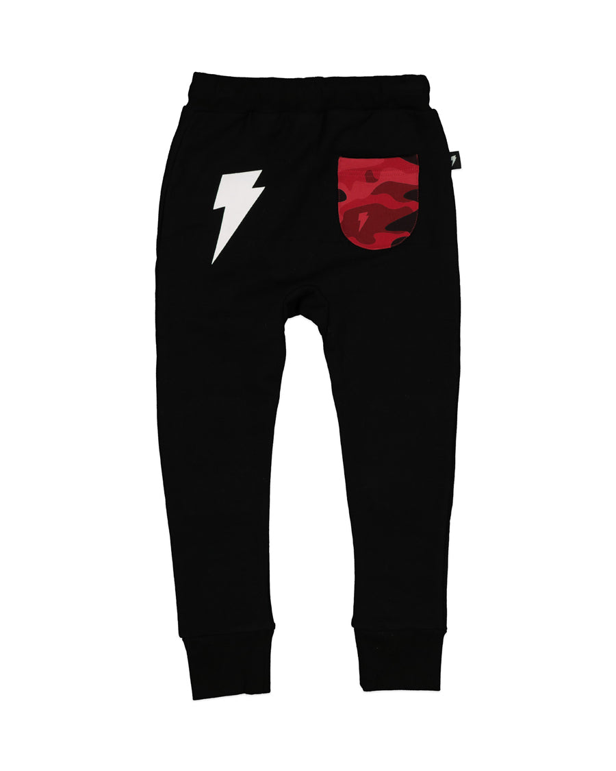 Brushed cotton / spandex pant in black with contrast knee patches & rear pocket in red camo & signature Radicool Dude thunderbolt in white on reverse. Our essential black trackies with a splash of RAD detailing.