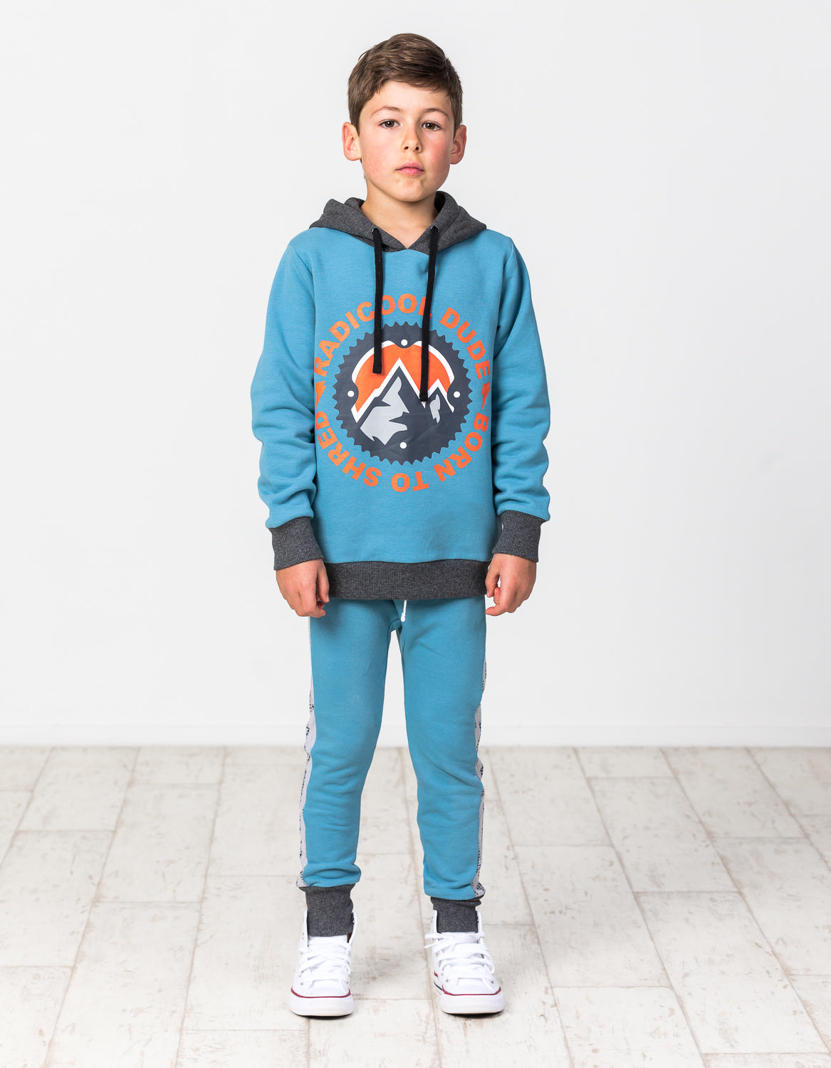 Brushed cotton / spandex pant in blue with printed tracks insert & side seam pockets. Signature Radicool Dude thunderbolt in orange on reverse adds a splash of colour to a practical trackie.