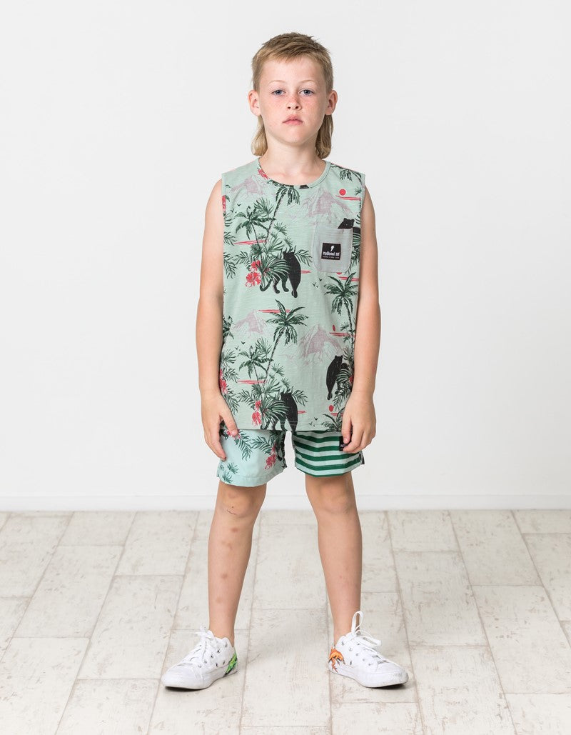 Stretch polyester board short with jungle jaguar yardage print & contrast stripe front leg panel & rear pocket. Comfy stretch waistband with workable white drawstring ties & soft mesh lining. For those long summer days by the water.