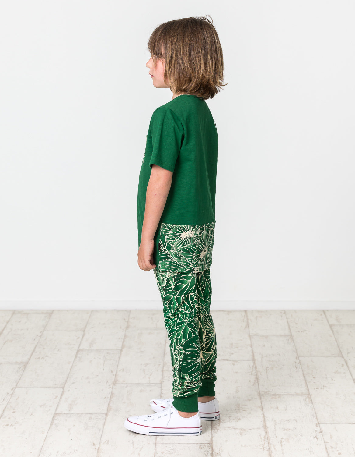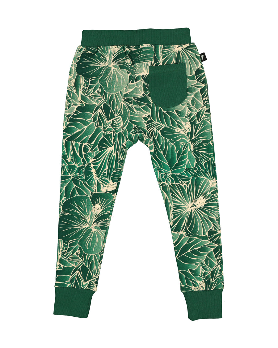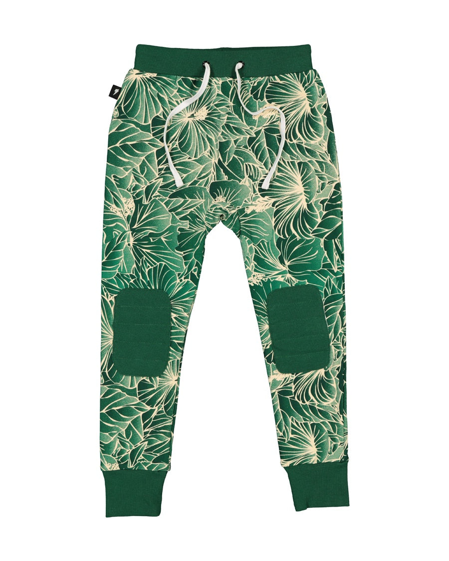 Cotton / spandex terry spacepant in hibiscus camouflage yardage print & contrast green rib trim, rear pocket & knee patches. For those cooler spring days when you need a little warmth.