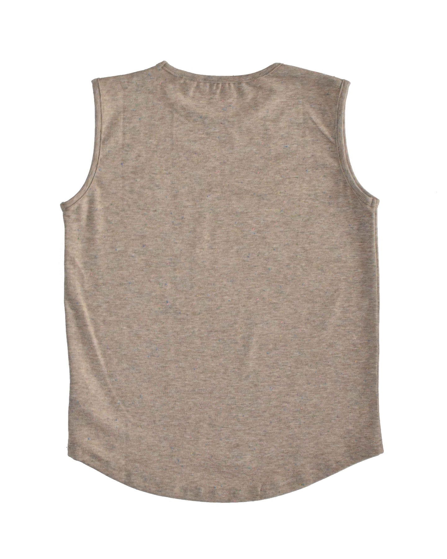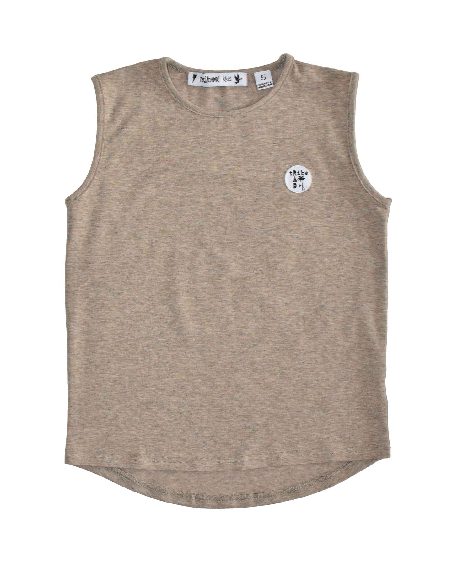 Cotton / spandex oatmeal tank with scoop hem & Rad Tribe logo badge on chest. Rad Tribe logo badge on leg. Made from totally rad recycled textiles indicated by the subtle multi-coloured flecks throughout the fabric. Super comfy & relaxed threads for your little groms.