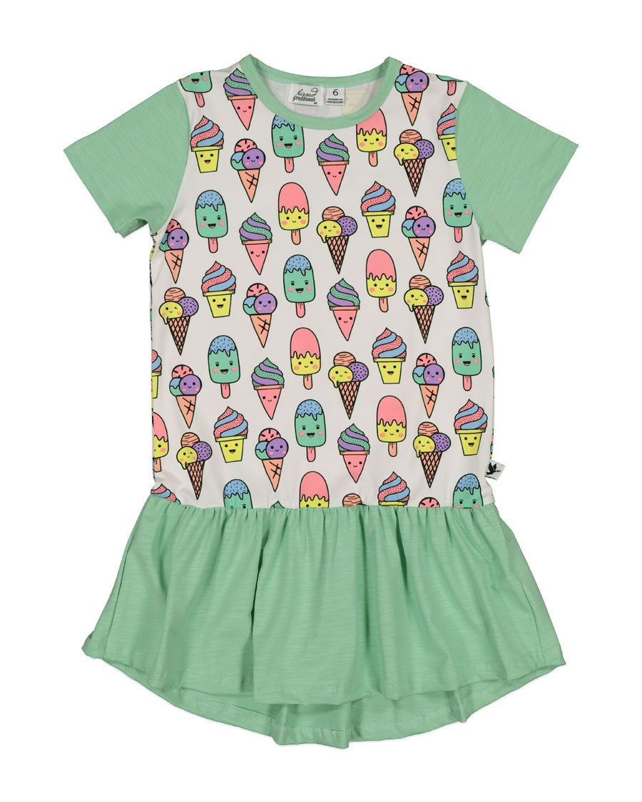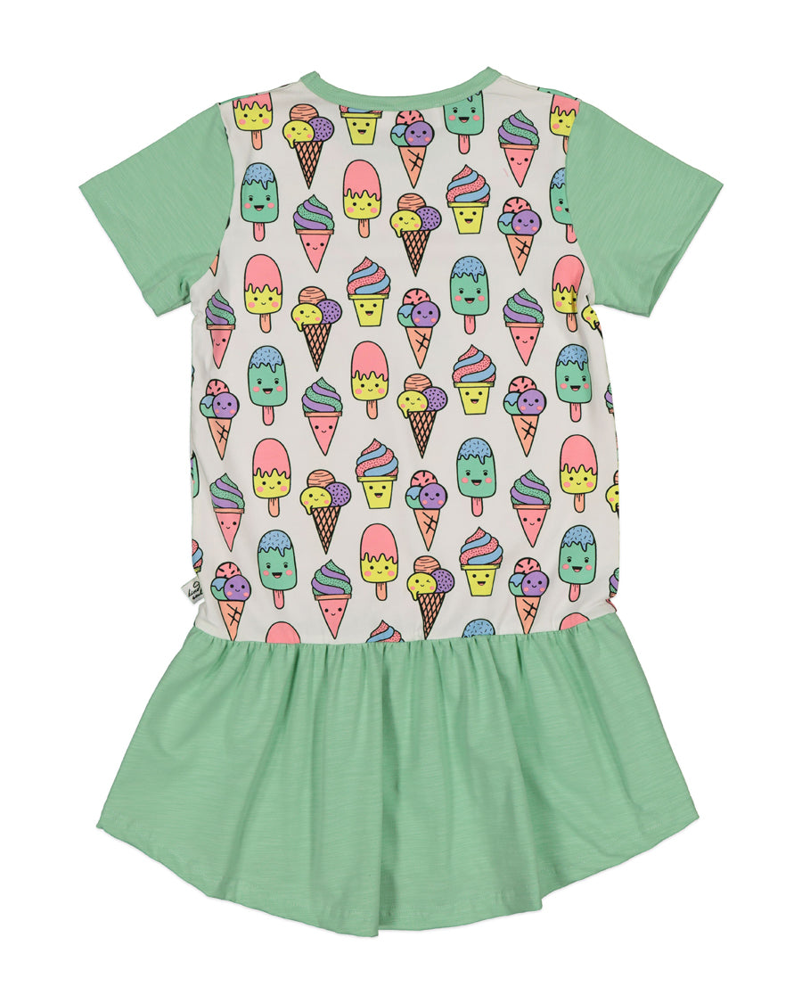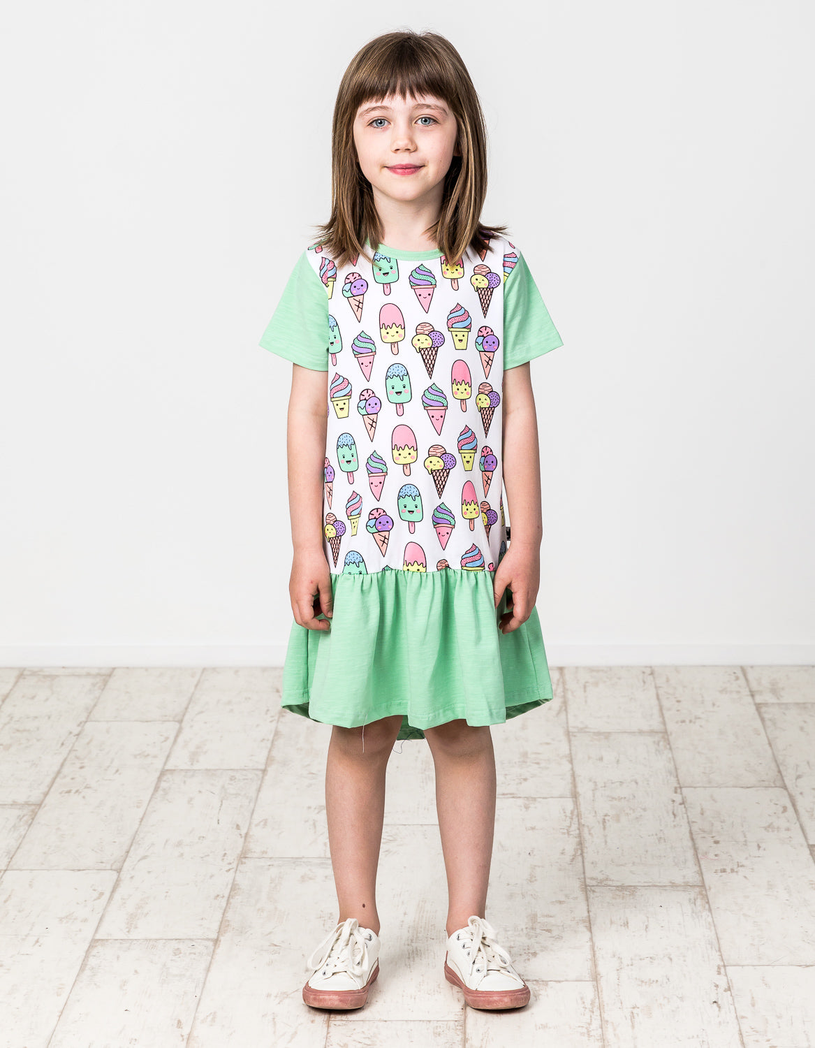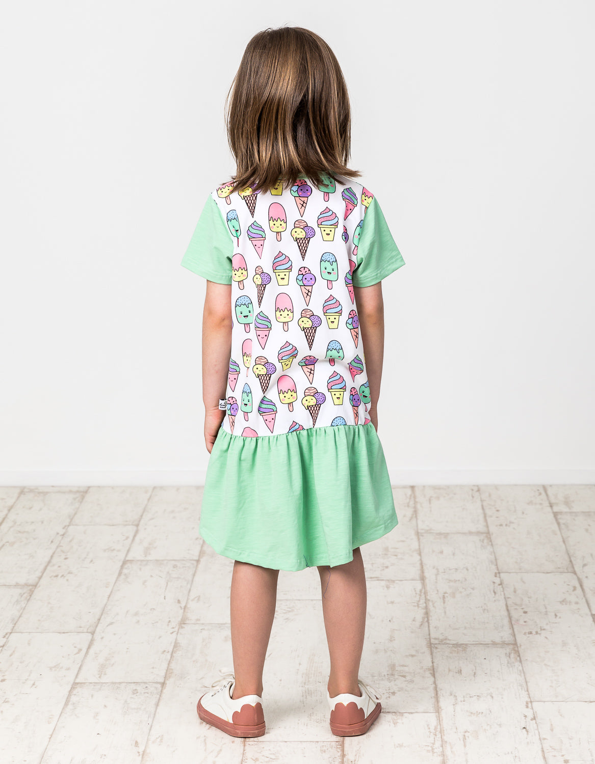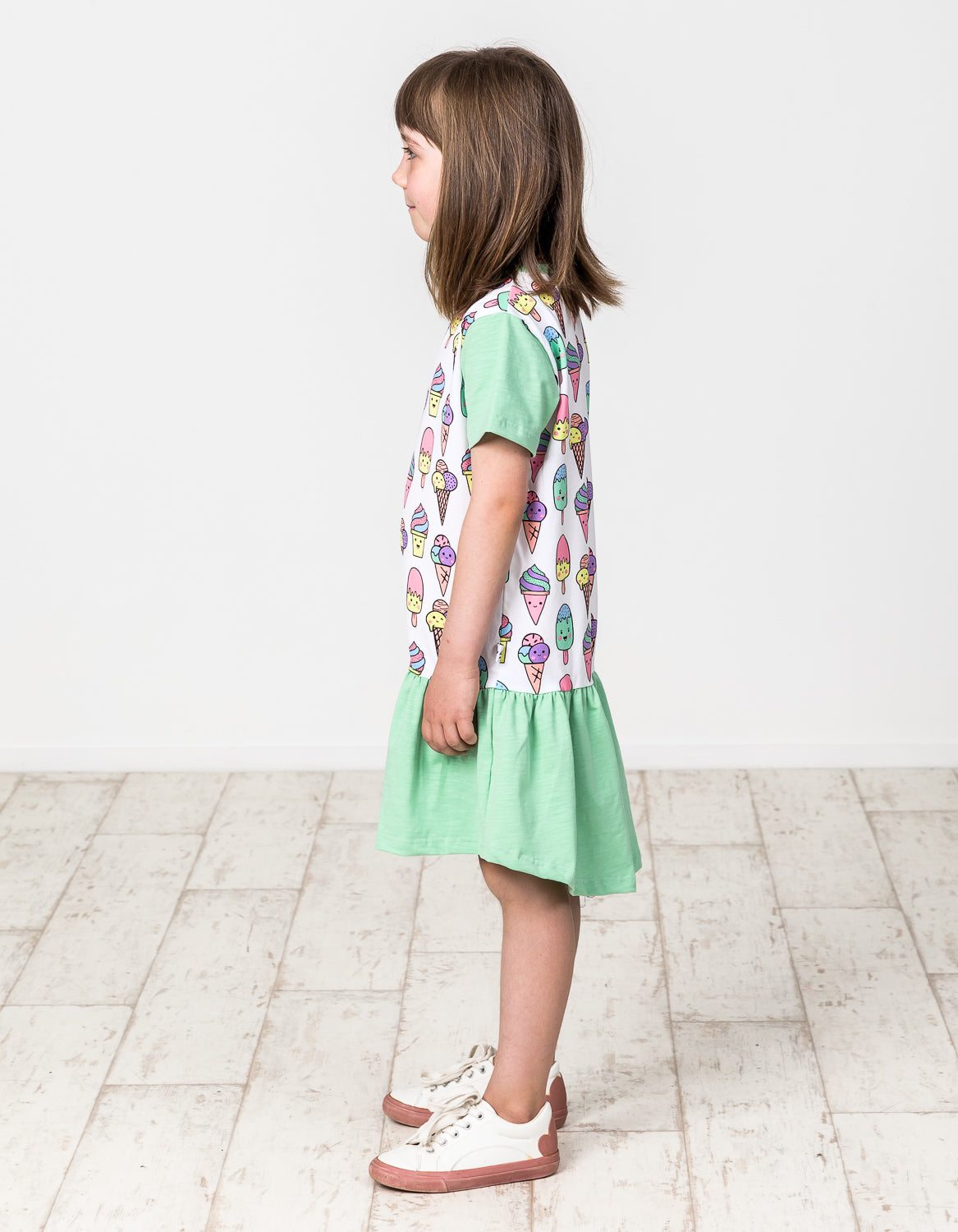 Cotton / spandex dress with all-over ice-cream print body & contrast sleeves & frilled skirt in mint. A fresh & summery dress for all those mint choc chip lovers out there!