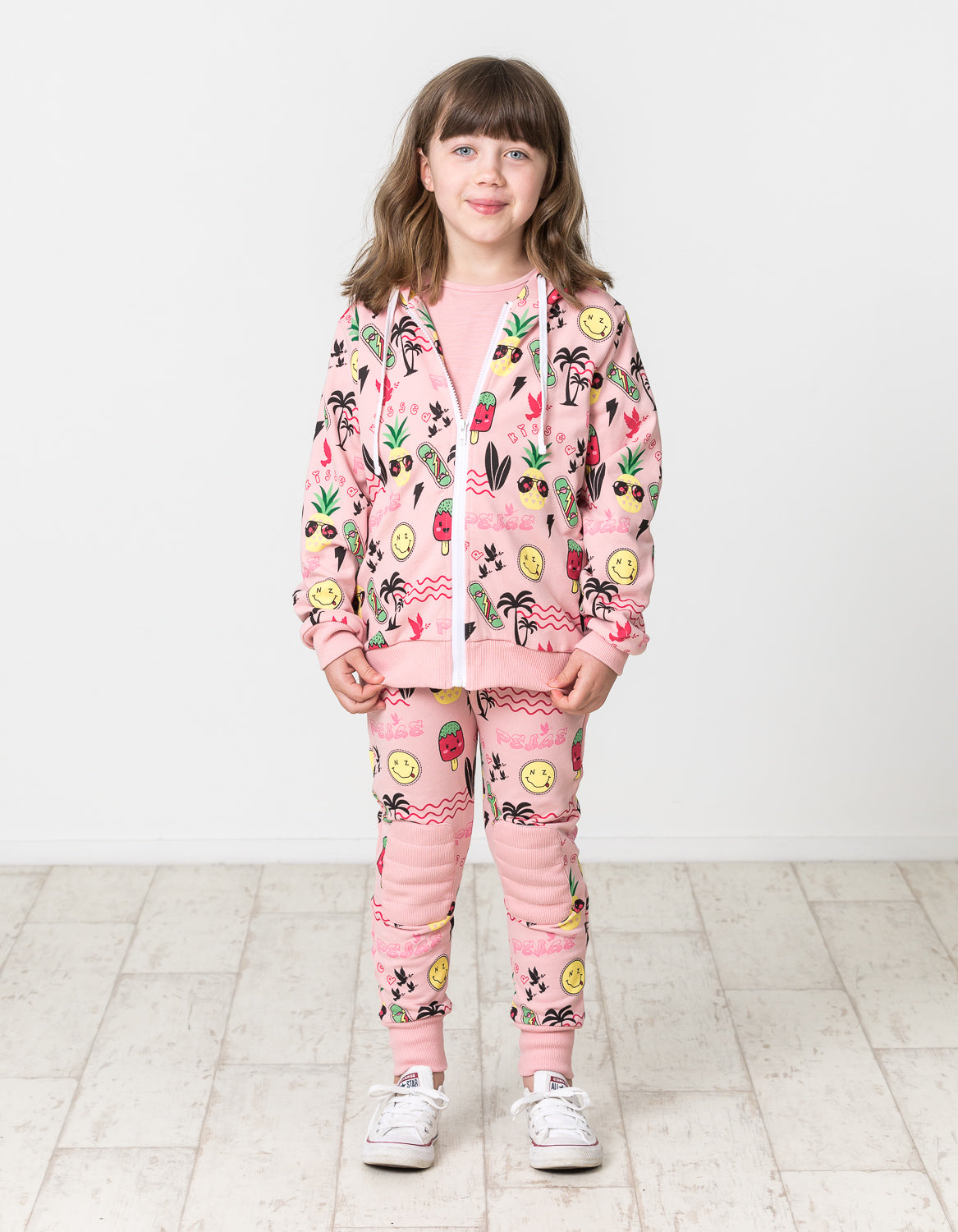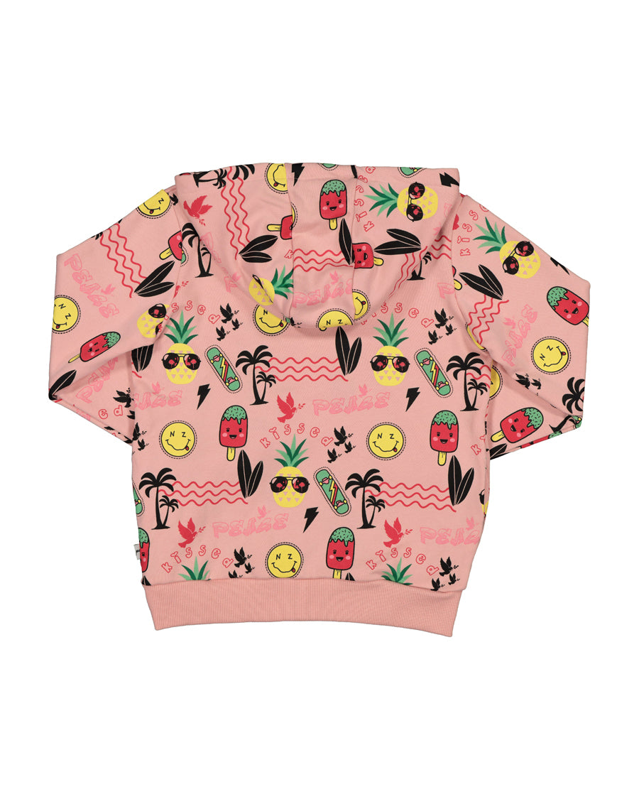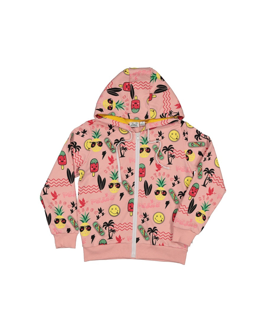 Cotton / spandex terry zip hood in blush with all-over summer faves print with a pop of watermelon pink in the hood. The perfect throw-on for a bit of extra warmth on those chilly spring days.