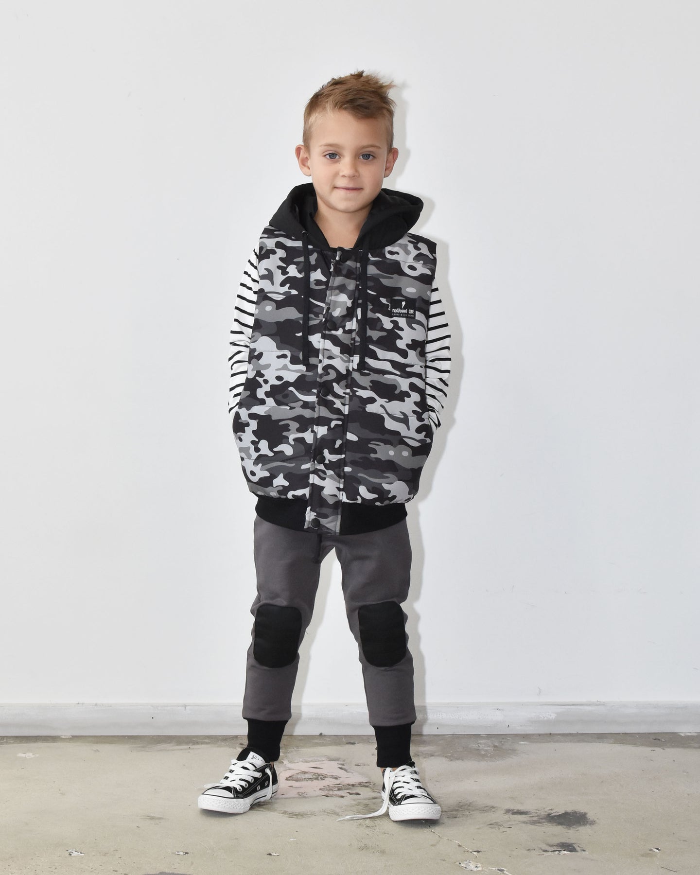 100% water repellant polyester with recycled eco poly-fill. This camo vest is everything! Super cosy, eco fill, puff vest. Camo body, with black waist trim, black zip and domes and black hood. This will keep the rain out and the warmth in.