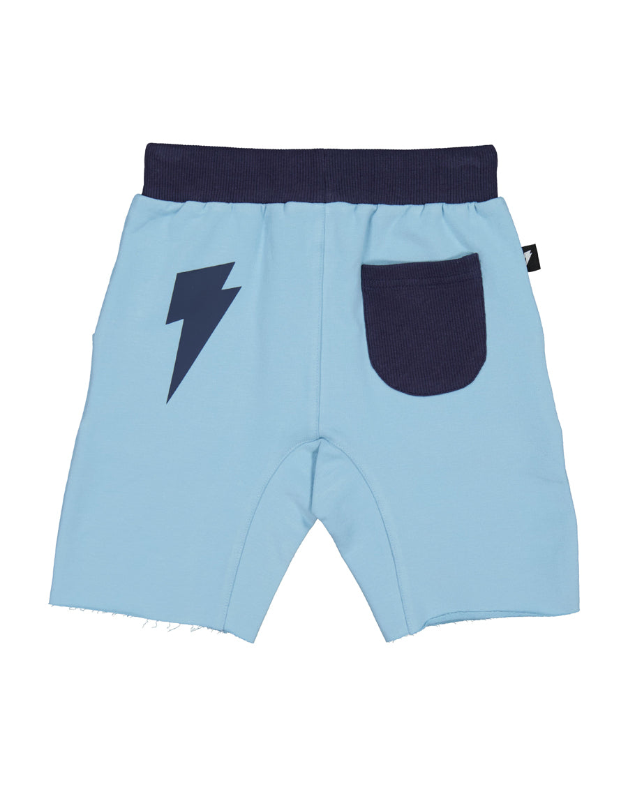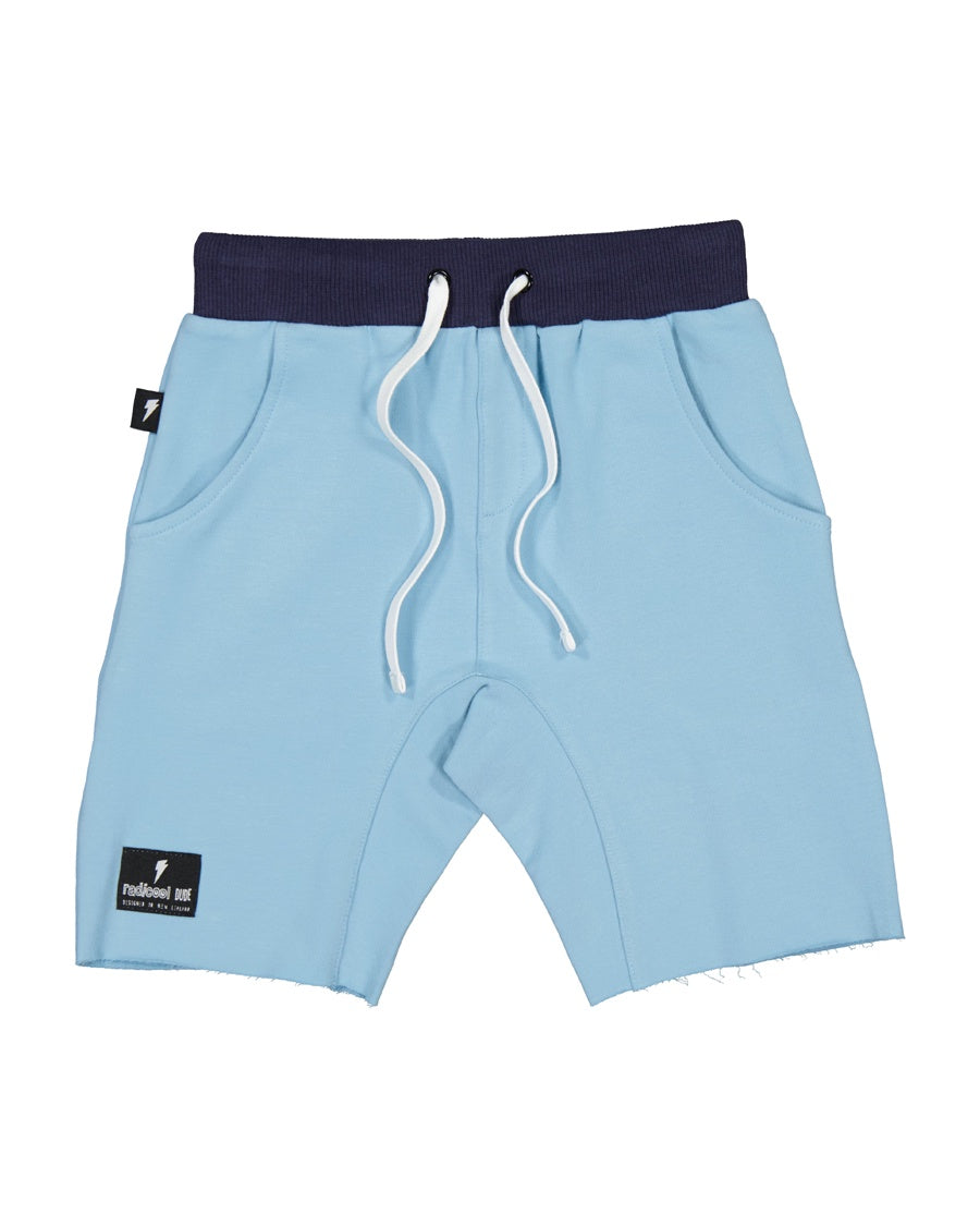 Cotton / spandex short in sky blue terry with raw hems, contrast rib navy waistband & rear pocket & signature Radicool Dude thunderbolt. Radicool Dude badge on right leg. The easiest & comfiest short to throw on with anything & everything.