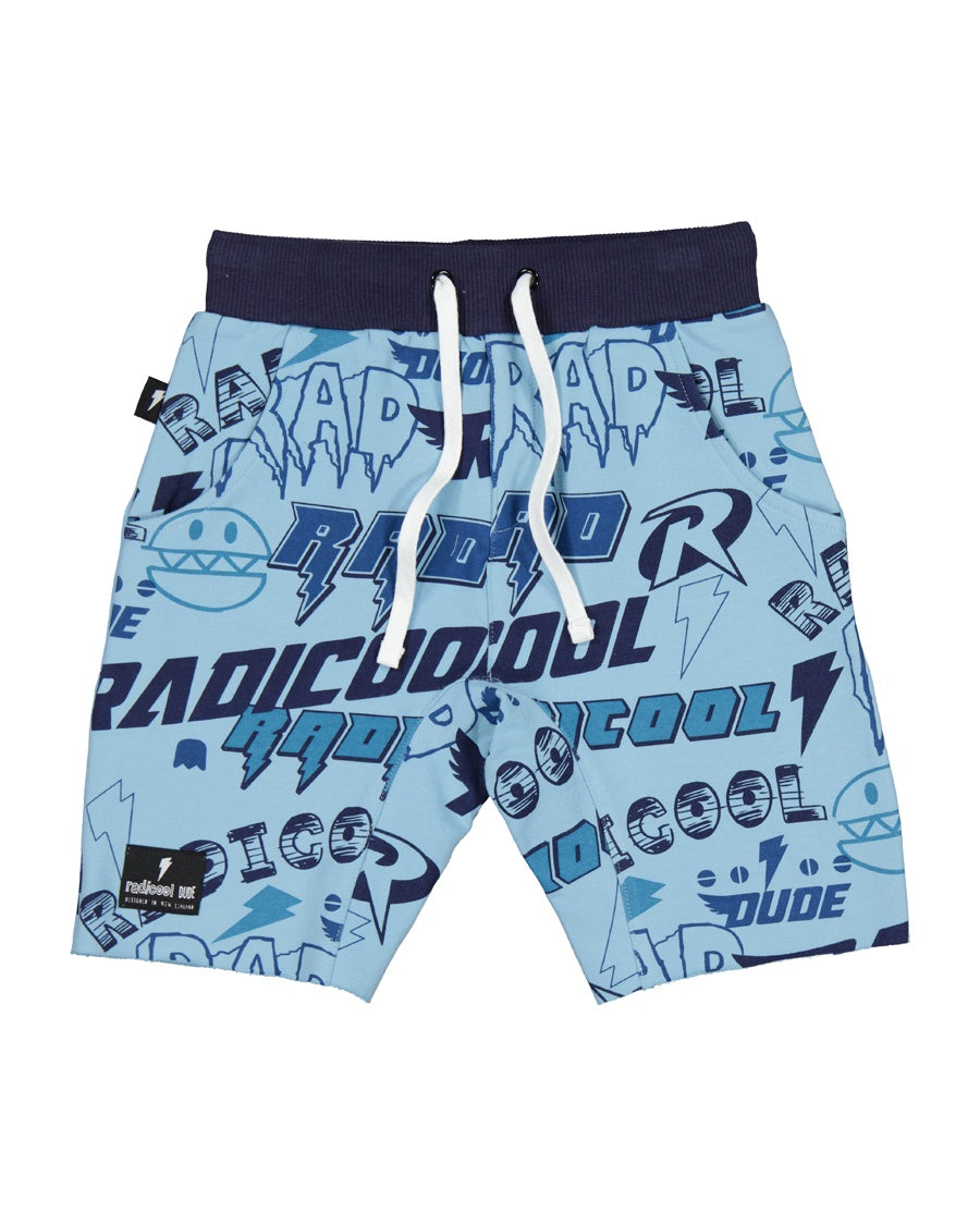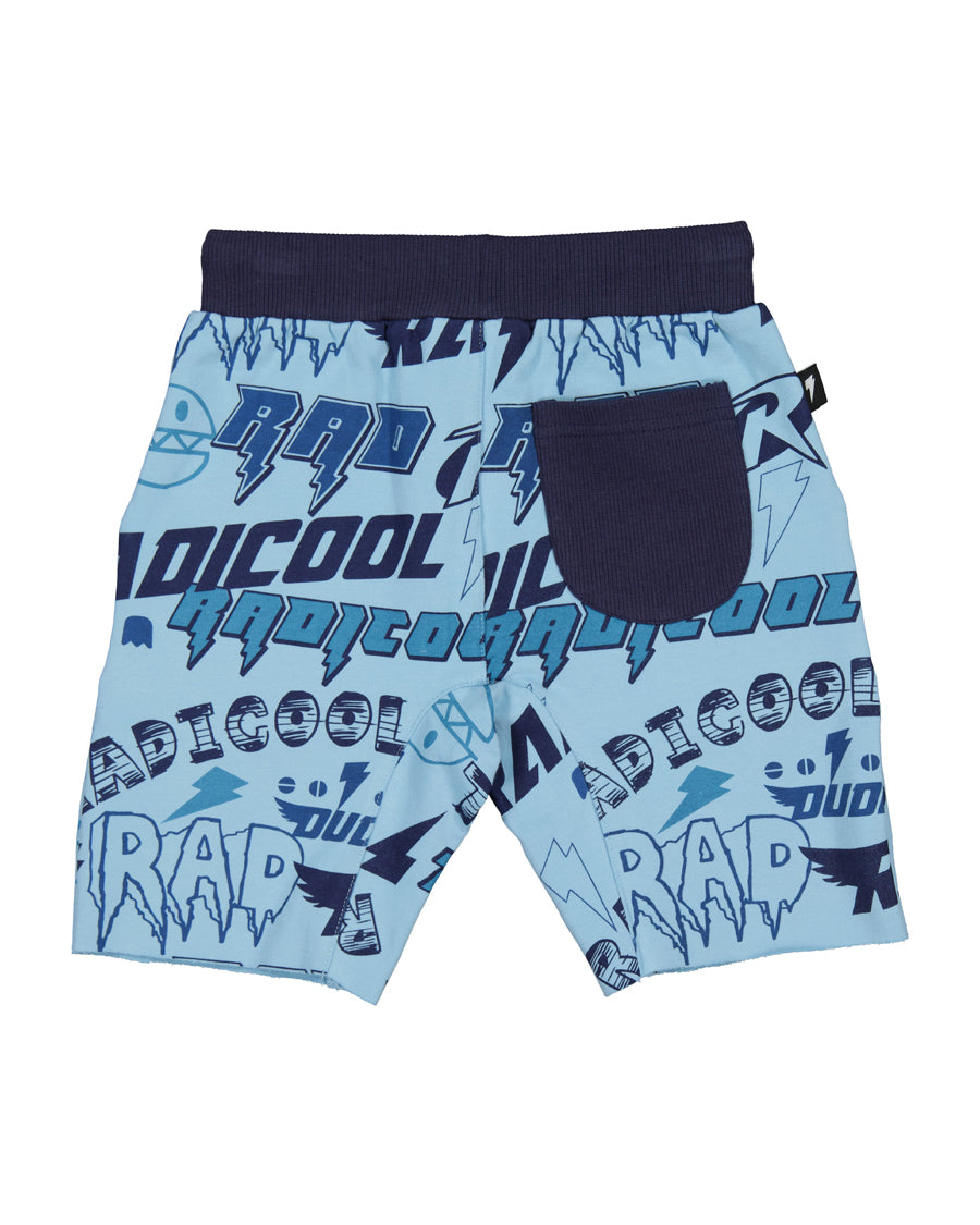 Cotton / spandex short in blue terry with Radicool yardage print. Contrast black trim & rear pocket, signature Radicool Dude thunderbolt in pink on reverse & badge on right leg. A fresh, fun mash-up for the Radicool Dude fan.