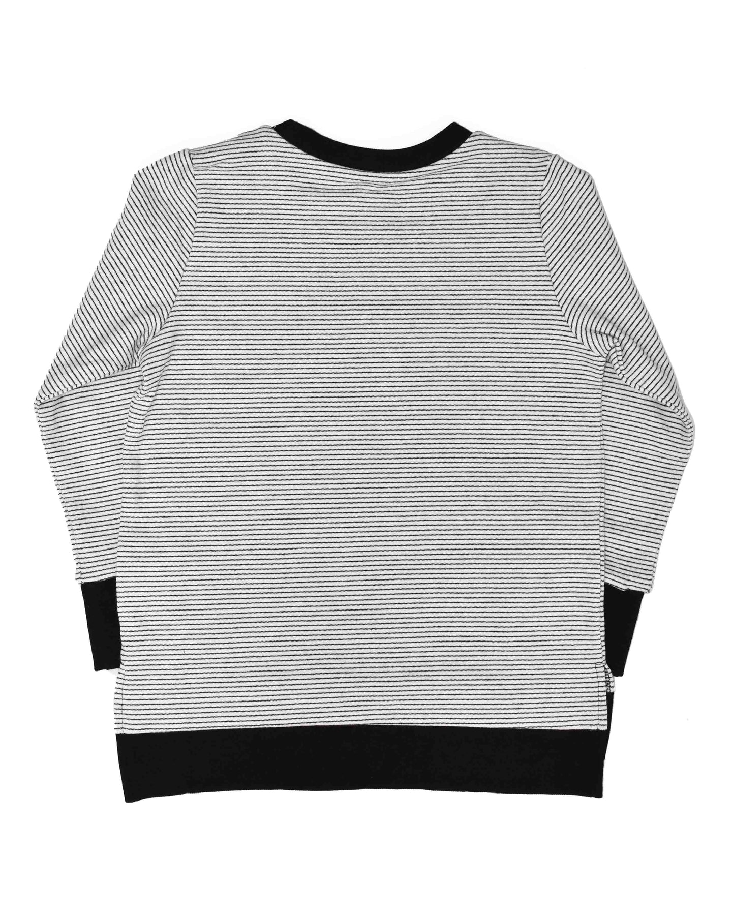 This crew is so good. The main fabric is white/cloud with a fine black pinstripe through it. It's a mid weight which is perfect for year round wear.